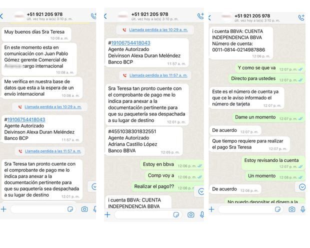 “Me dijeron que lo enviado superaba los 25 mil dólares. Supuestamente eran aparatos electrónicos como laptops y celulares”, comentó. “Le escribí a mi tía para avisarle y ella me pidió que haga el pago, que ella me estaba haciendo una transferencia, pero como lo hacía del extranjero iba a demorar 48 horas en llegarme”.