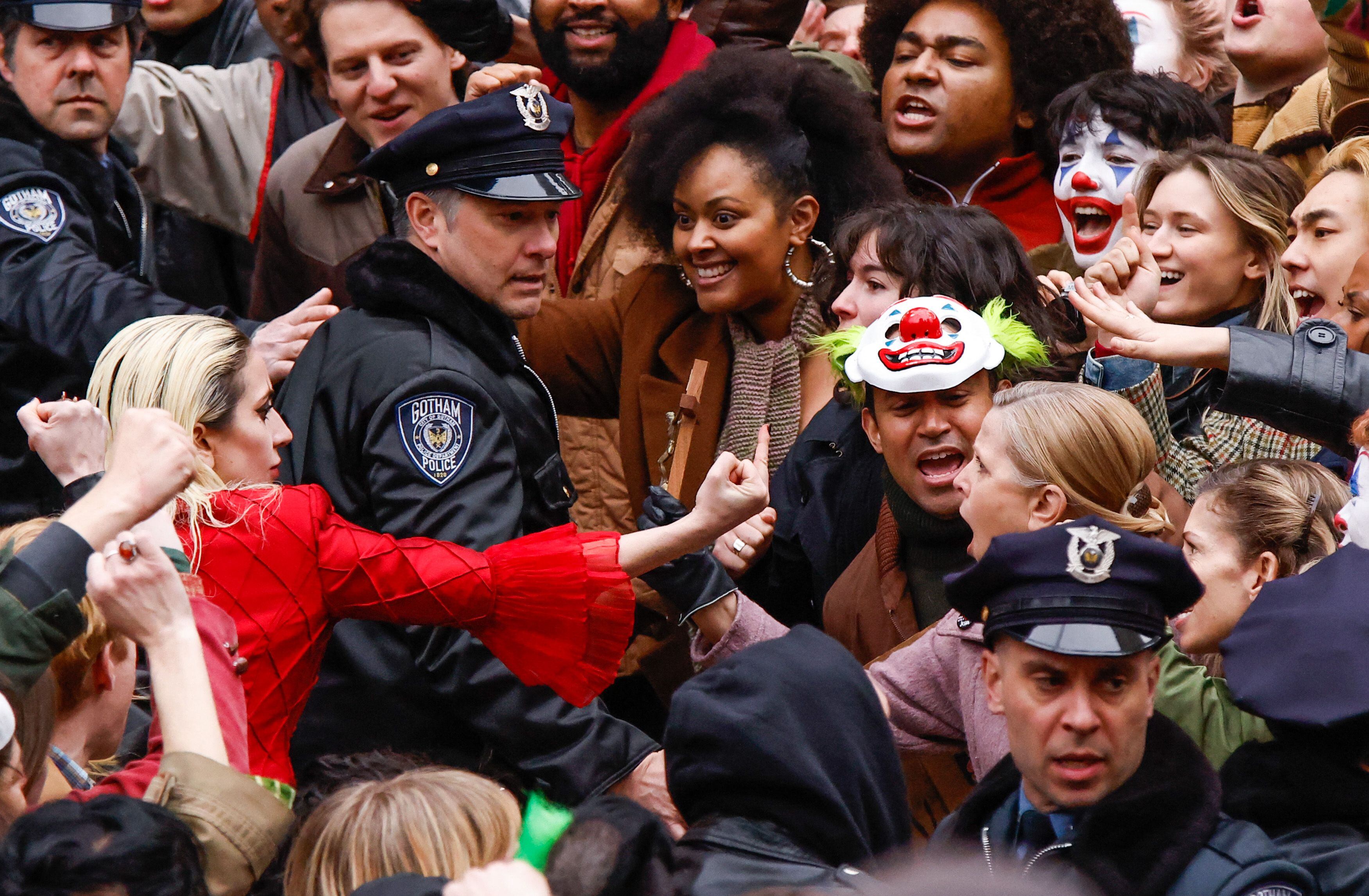 A su alrededor hay una multitud de manifestantes con carteles que dicen frases como: “Free Joker” y “¡Joker, cásate conmigo! XOXO”.