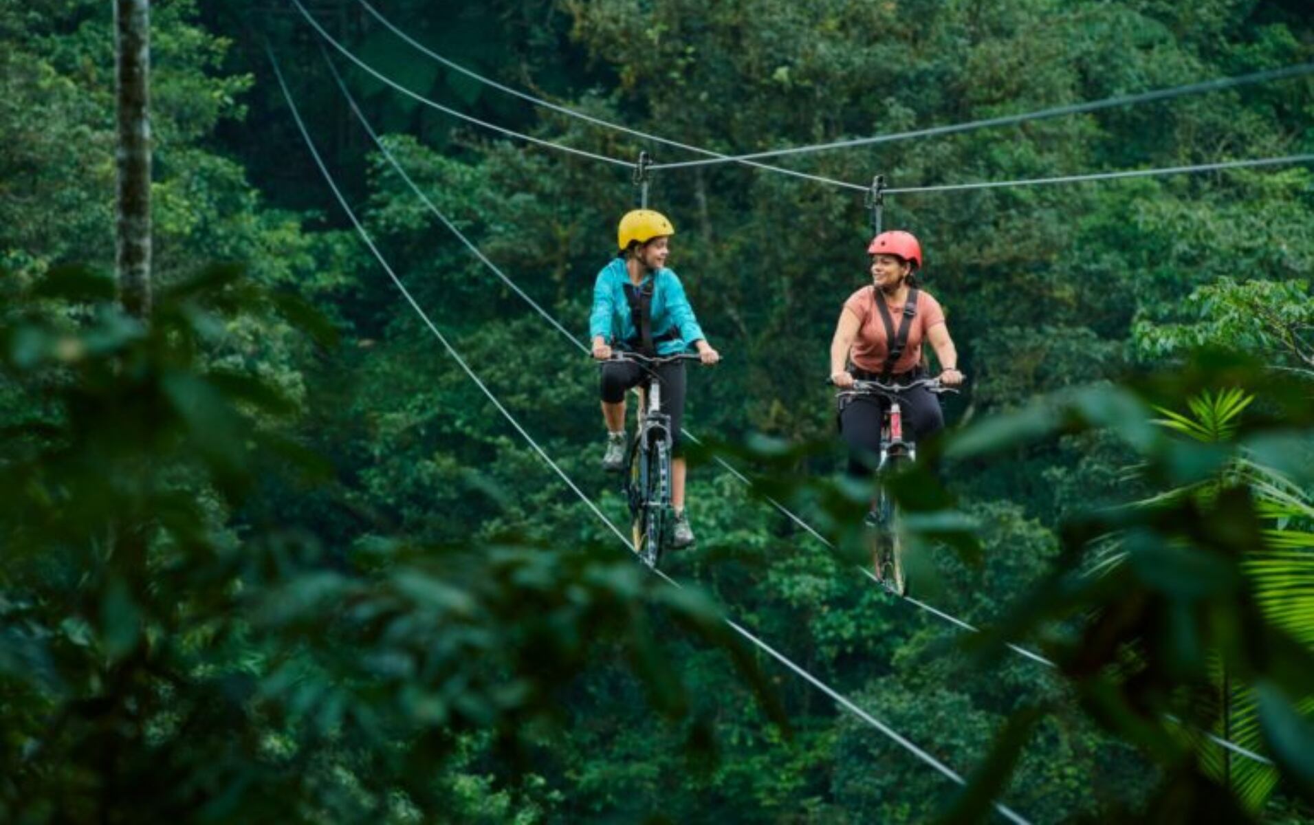 Este tour se centra, principalmente, en un paseo en bicicleta a través de un cable suspendido, el cual está ubicado a una altura de 60 metros. El recorrido de ida y vuelta es de 400 metros. Esto le brinda a los visitantes una experiencia inigualable en Costa Rica, rodeados de impresionante naturaleza.