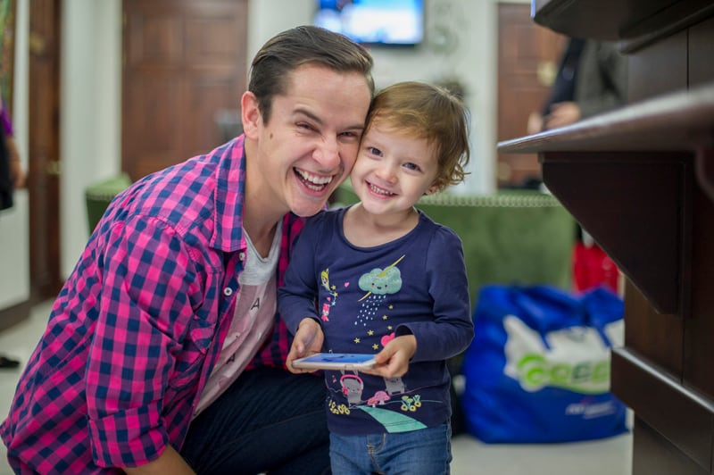 De la mano de la niña que admira a Mickey Mouse, se detiene en el medio de set, la coloca a su lado, al mismo tiempo que batalla por sacarle una sonrisa.