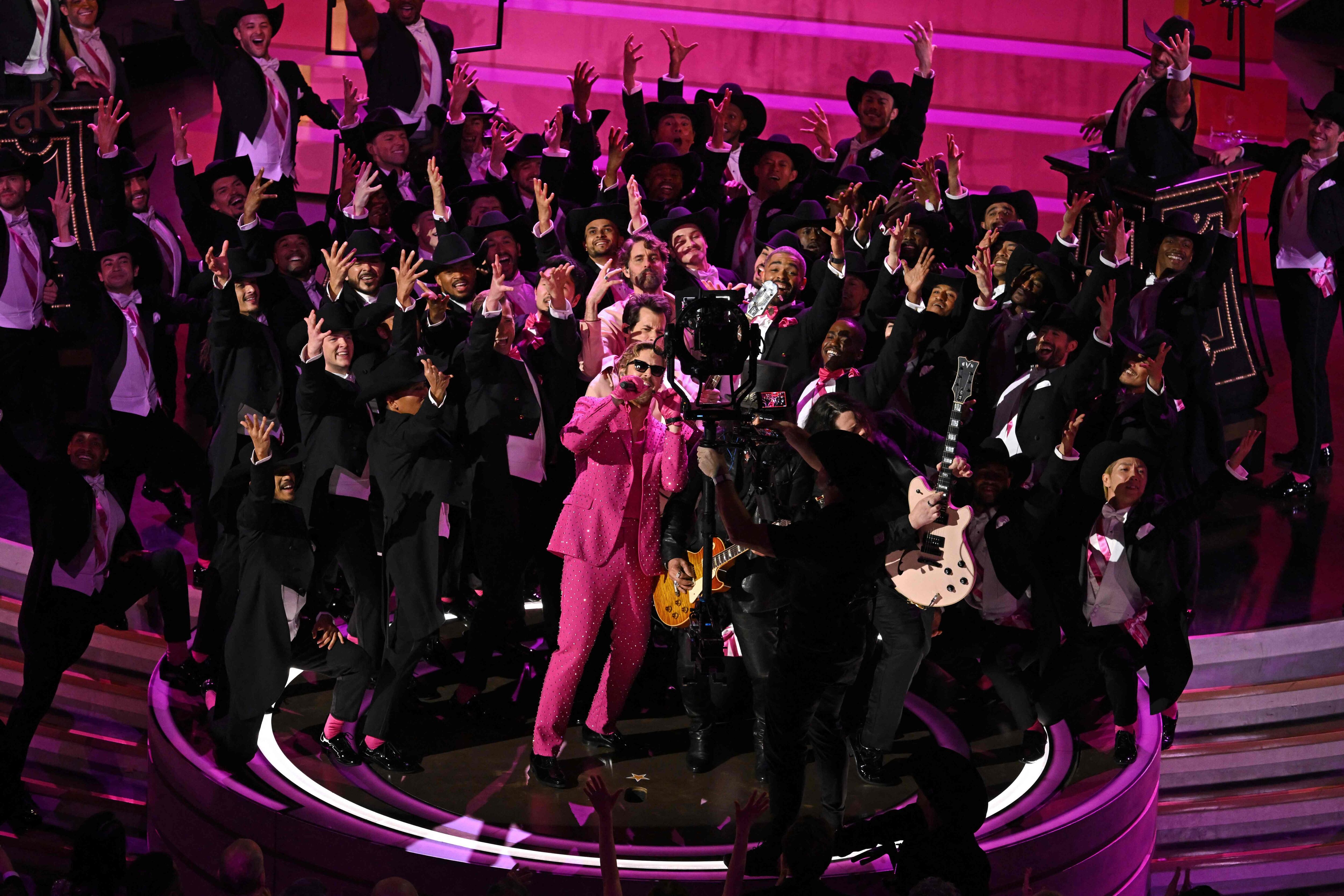 En el escenario, Gosling se juntó a Mark Ronson y Andrew Wyatt, compositores y productores de la pieza, mientras que otros Ken de la película como Simu Liu y Kingsley Ben-Adir, se unieron al espectáculo como bailarines.