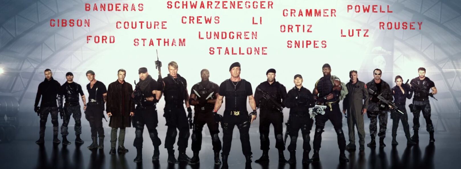 La lista la completan Sylvester Stallone (director), Jason Statham, Jet Li, Dolph Lundgren, Randy Couture, Terry Crews y Arnold Schwarzenegger, entre otros mercenarios de la famosa saga.