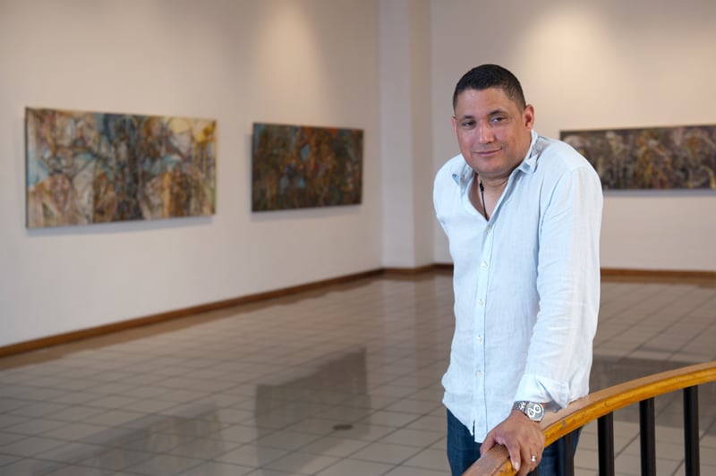Aunque a primera vista resulten caóticas, las pinturas de Alarcón son narrativas. “Es como si estuvieras en un laberinto y en cada esquina hubiera un camino a seguir”, dice el pintor.