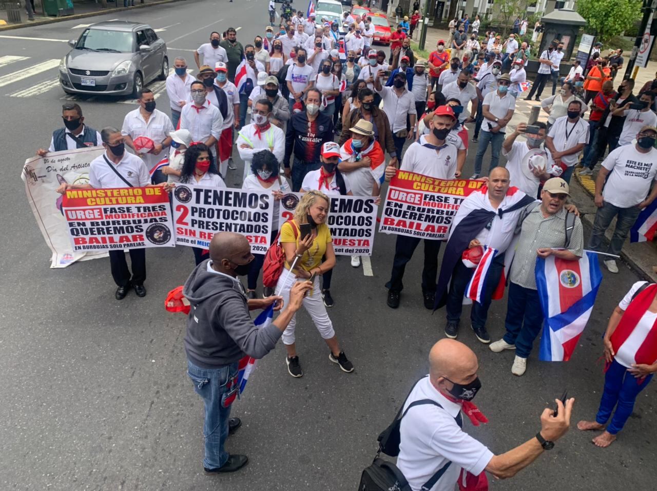 Cerca de 150 personas entre artistas y trabajadores de la industria del entretenimiento realizaron una marcha pacífica la mañana de este domingo 25 de julio por las calles de San José, con el fin de pedirle al Gobierno mayor apertura para la realización de actividades culturales.