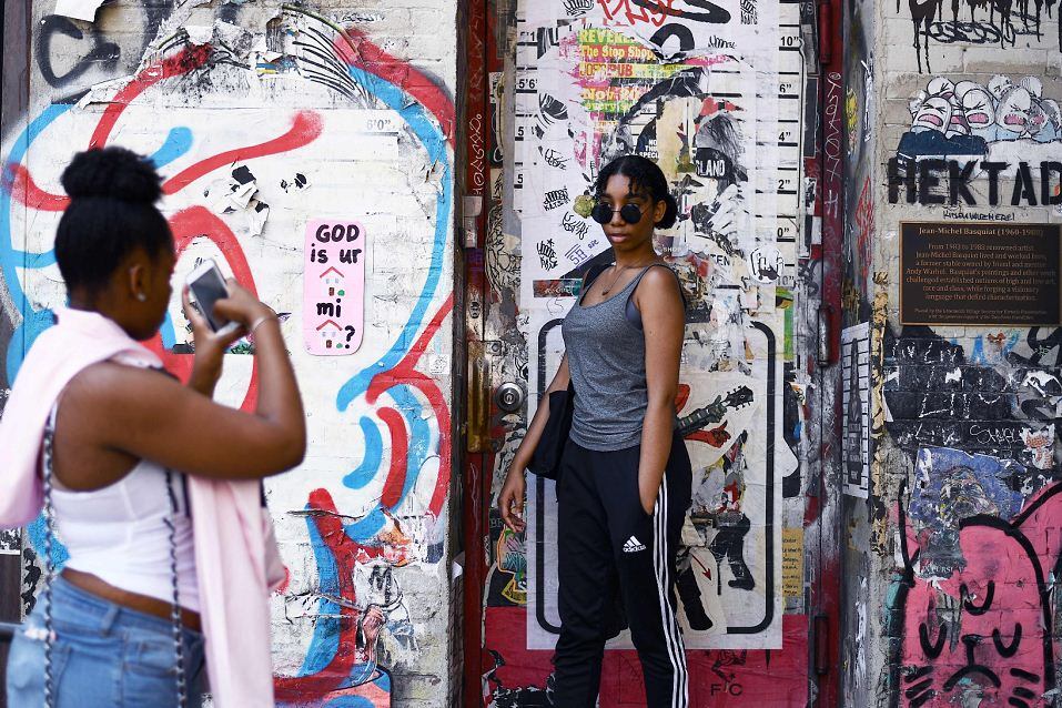 Un grafiti representa a Basquiat en Brooklyn, Nueva York. Este año, una pintura de 1982 se convirtió en la obra subastada más cara de la historia estadounidense. (AFP PHOTO / Thomas URBAIN)