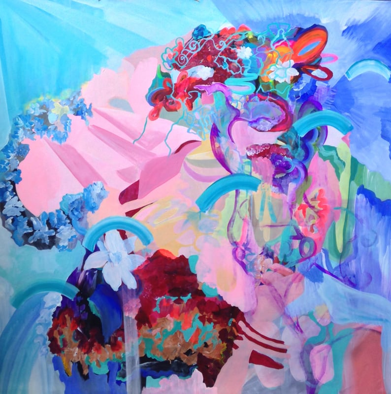 “¿Por qué bailan sus colores?” le preguntamos. “En mi obra puede entrarse por la euforia de los colores y por el gran formato, pero se llegará a un estado mental nada tranquilizador. En mis cuadros hay un continuo movimiento debido a estructuras que se abren, a las transparencias, y a la abundancia de recursos en la ornamentación. Trabajo sumando capas de improvisación, aunque parto de estructuras tomadas de la naturaleza, como flores”, nos confía.