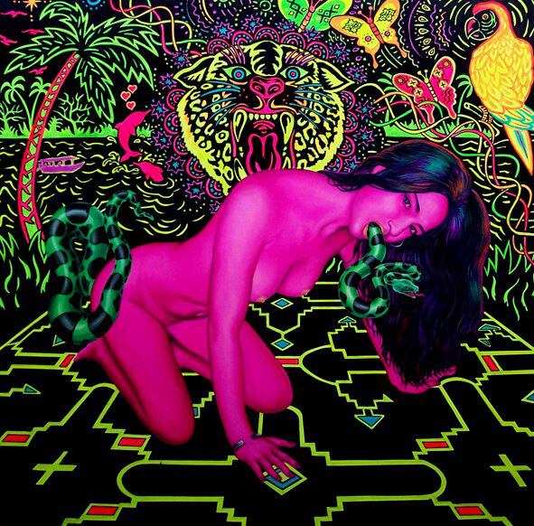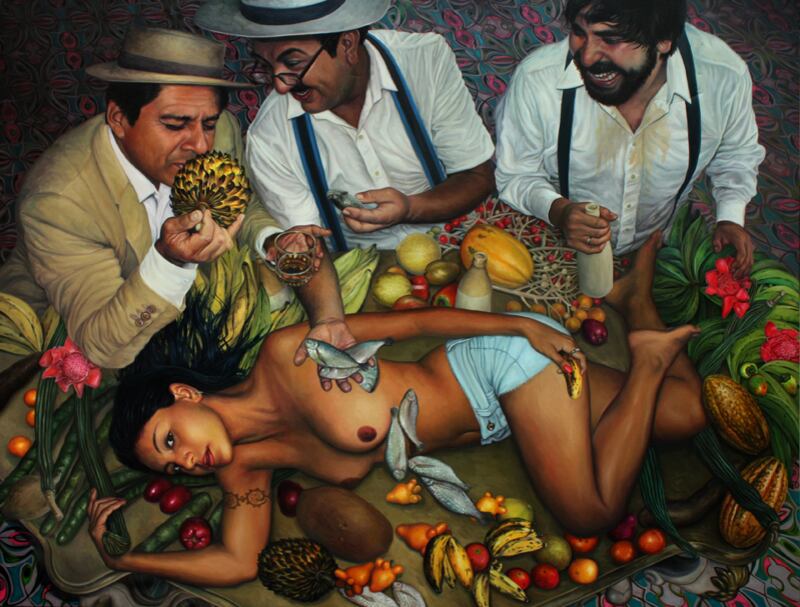 Christian Bendayán está atrapado en la selva. El pintor dedica su tiempo y sus lienzos a las escenas vibrantes y alegóricas de quienes lo acompañan en esa estancia: una cultura “chola” urbana y pop del Perú, sumergida en la espesura del Amazonas.