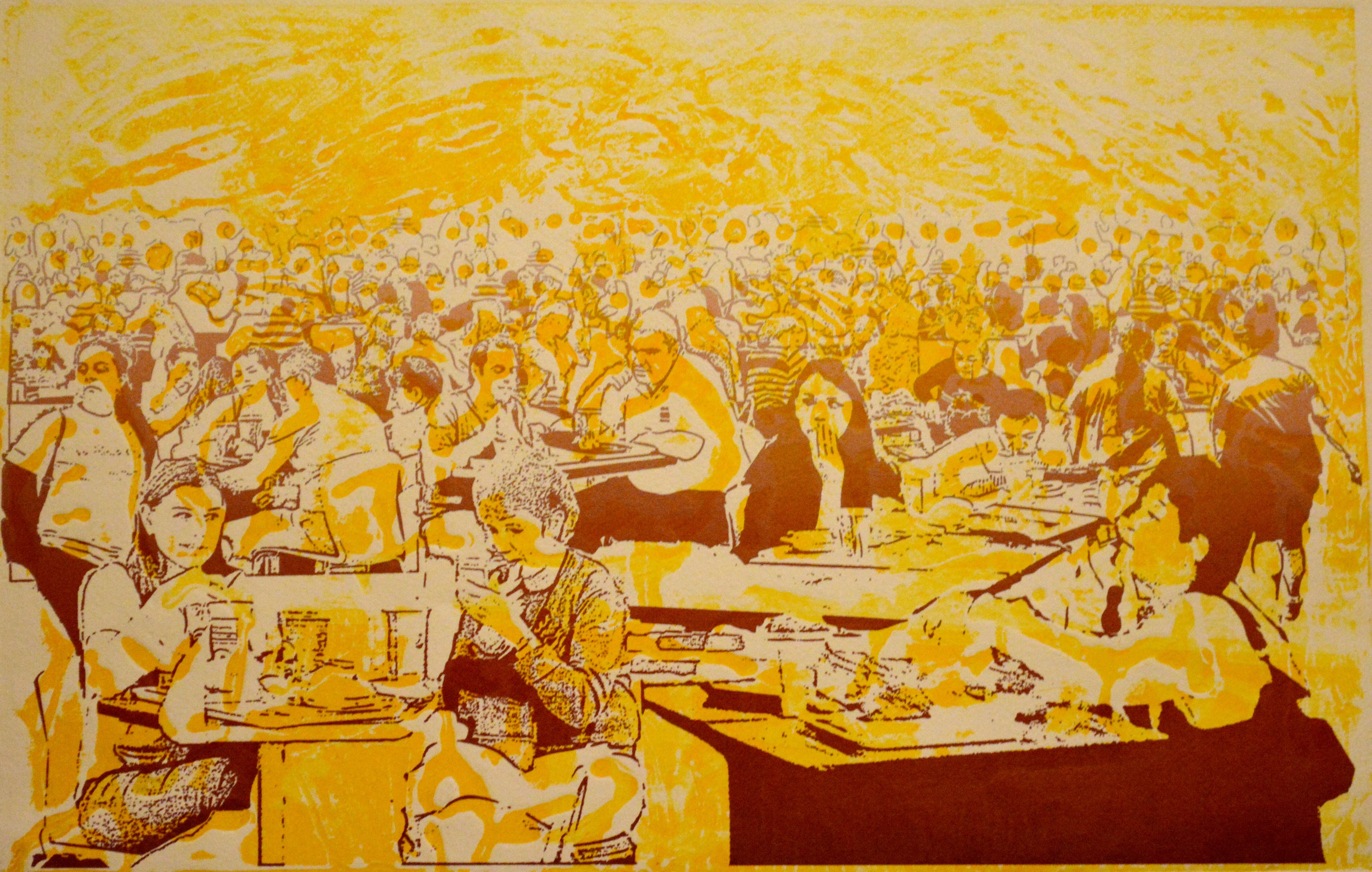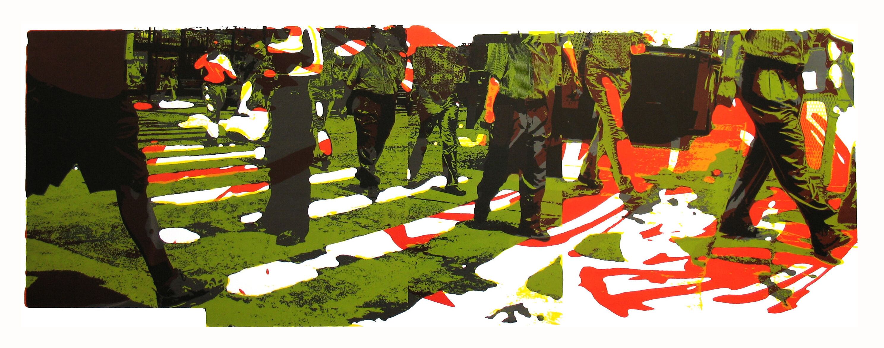 Sebastián Mello brinda la serigrafía Mancha urbana, una escena de una calle neoyorquina en verdes y rojos. En rojo –y negro– también aparecen en Espera y Regreso, de Jeffry Gibbs Ulloa. Son dibujos a lápiz de cera y con veladuras en tinta de colores que varían su tono según sea la absorción del material.