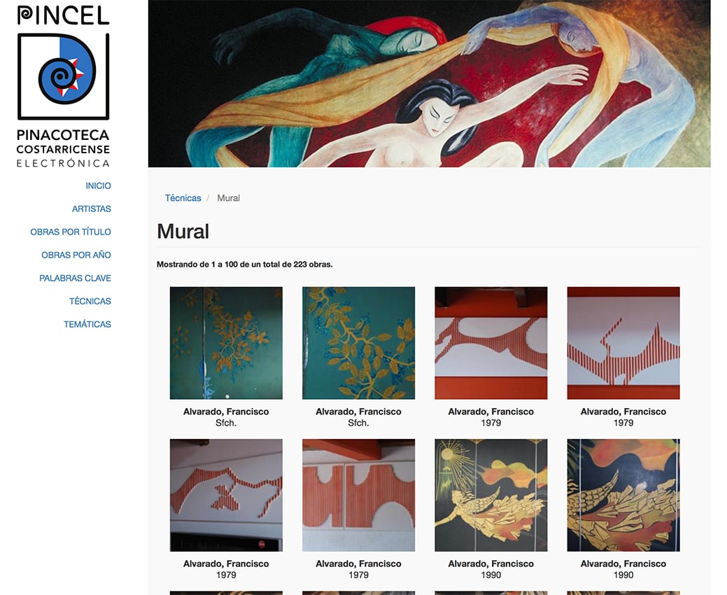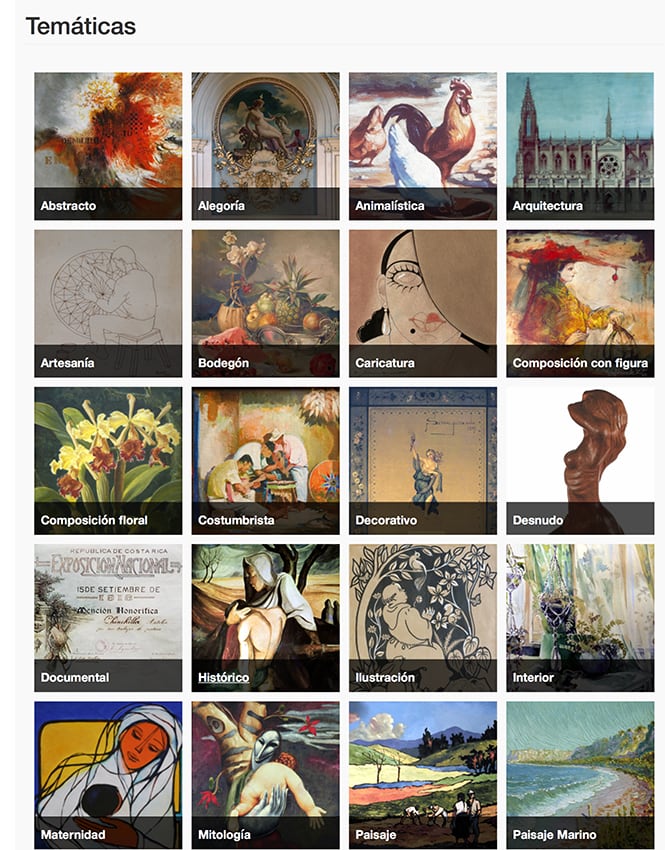 En el sitio, las obras se clasifican por artista, título, palabra clave, técnica y temática. Allí se encuentran desde creaciones de clásicos del arte costarricense como Tomás Povedano, Margarita Bertheau o Max Jiménez hasta trabajos de artistas muy destacados en la actualidad como Lola Fernández, José Sancho y Rafa Fernández, entre muchos.
