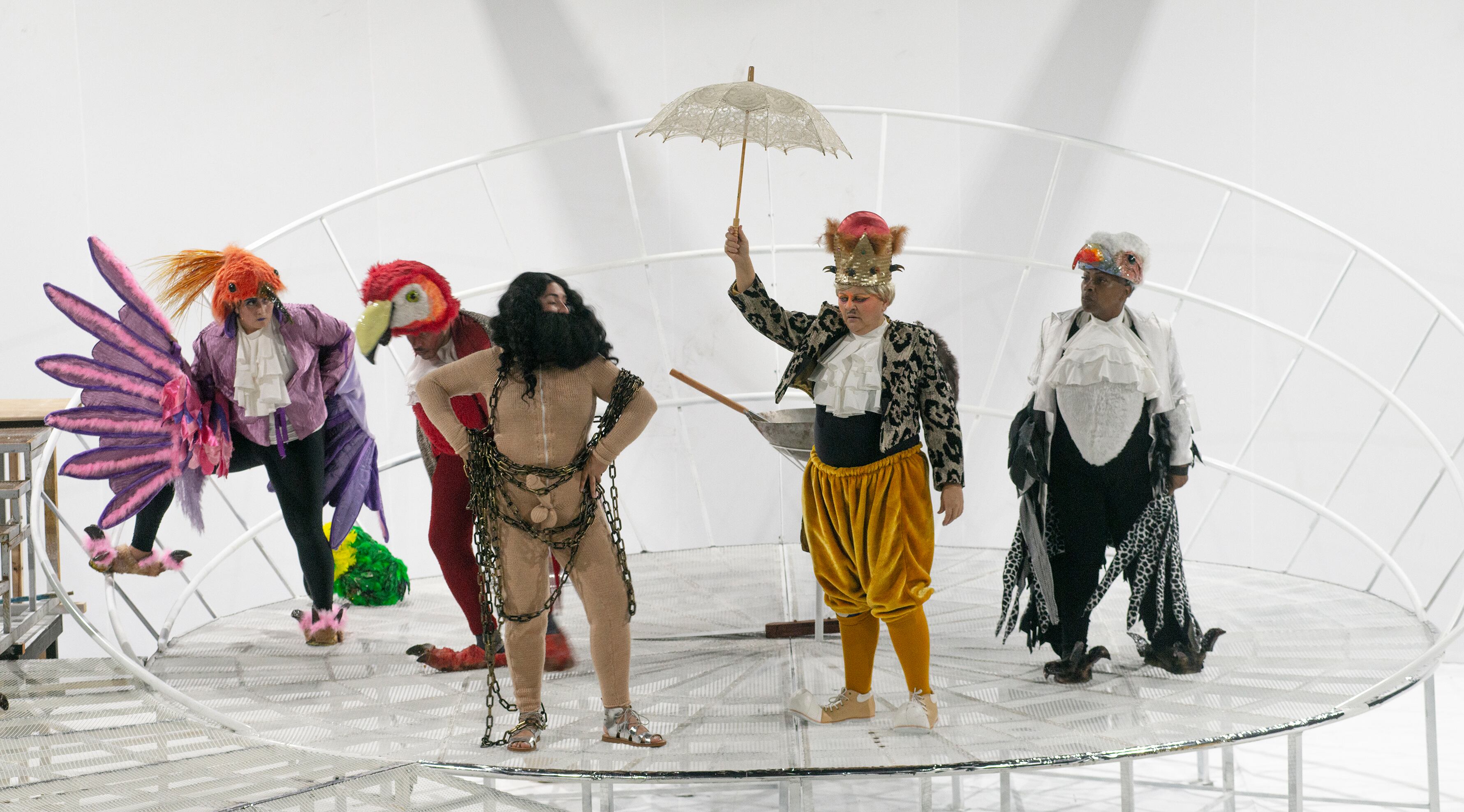 Actuación: Ignacio Jesús Álvarez Yannarella (Ave narradora), Marcia Saborío de la Fuente (Pistetero), Arturo Campos Solano (Evélpides), Érick Córdoba López (Criado Ave / Sacerdote / Heraldo / Agente judicial / dios Tribalo), Manuel Ruiz García (Abubilla / Heracles), Winston Berris Washington Cummings (Ave coro 1), Priscilla Gutiérrez Goñi (Ave coro 2), Eder Porras Brenes (Ave coro 3), Thelma Darkins Bucknam (Corifeo), Vanessa Apablaza Zabala (Metón / Mensajero 1 / Prometeo), Pablo Morales Rodríguez (Poeta / Inspector / Mensajero 2 / Parricida / Poseidón), Ana Leonor Saravia Vivas (Adivino / Vendedor / Iris / Cinesias / Realeza)