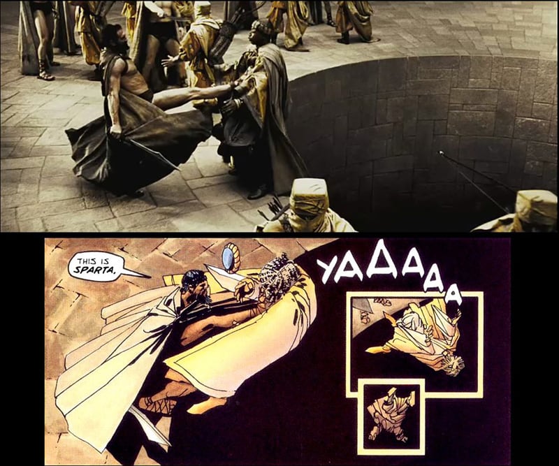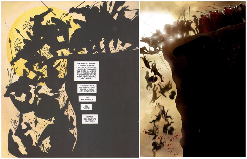 Como pocas veces se ha visto en el cine, la versión fílmica de 300 buscó adaptarse lo más posible, en su estilo visual, a la obra original de Frank Miller (como ya se había hecho en el 2005 con Sin City , otra novela gráfica del mismo autor), al grado de que varias escenas, como la del joven Leónidas matando a un lobo con una lanza o la caída por un acantilado de los guerreros persas empujados por los espartanos, fueron una copia fiel –se diría que “al carbón”– de las viñetas del gran dibujante nacido en Maryland .