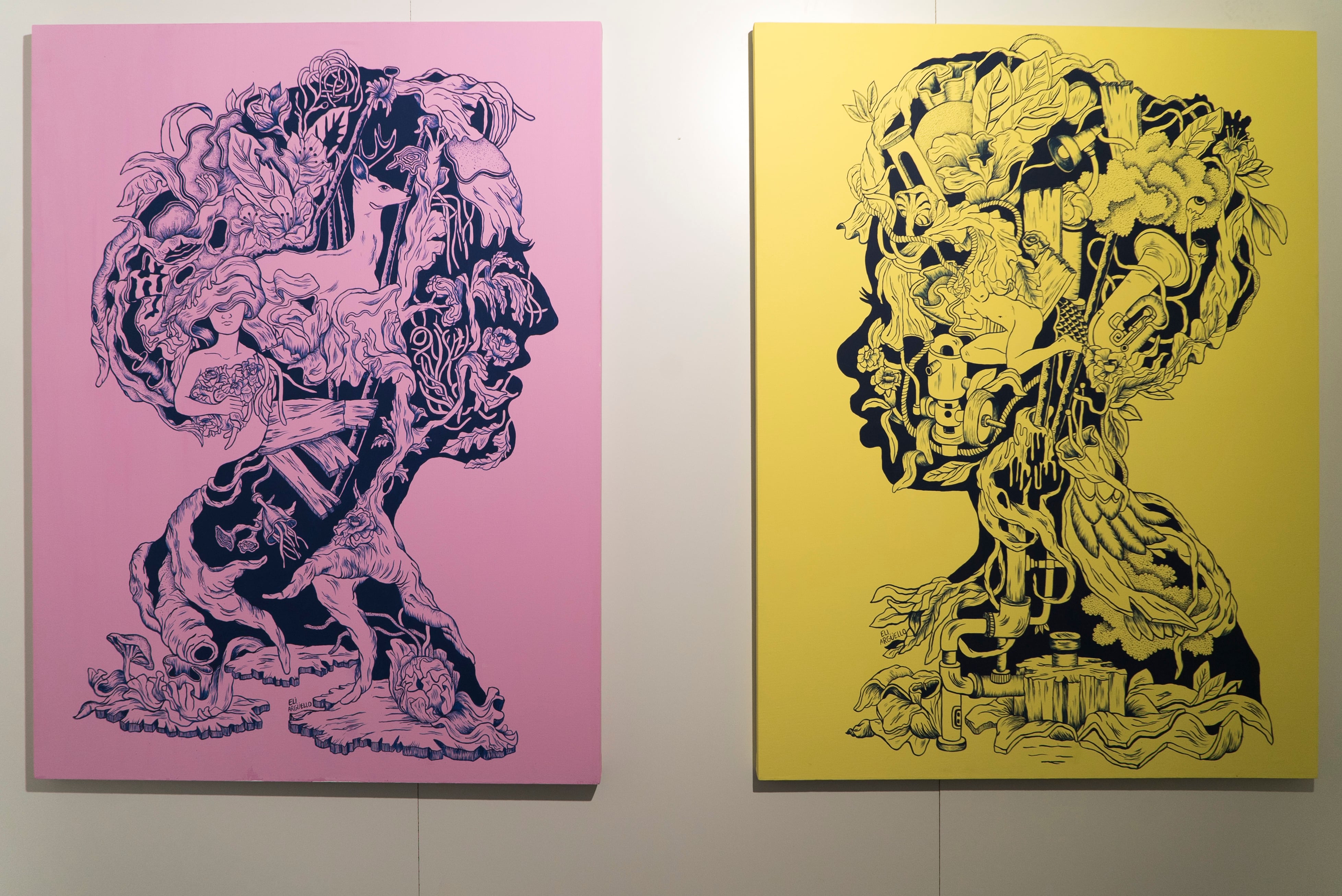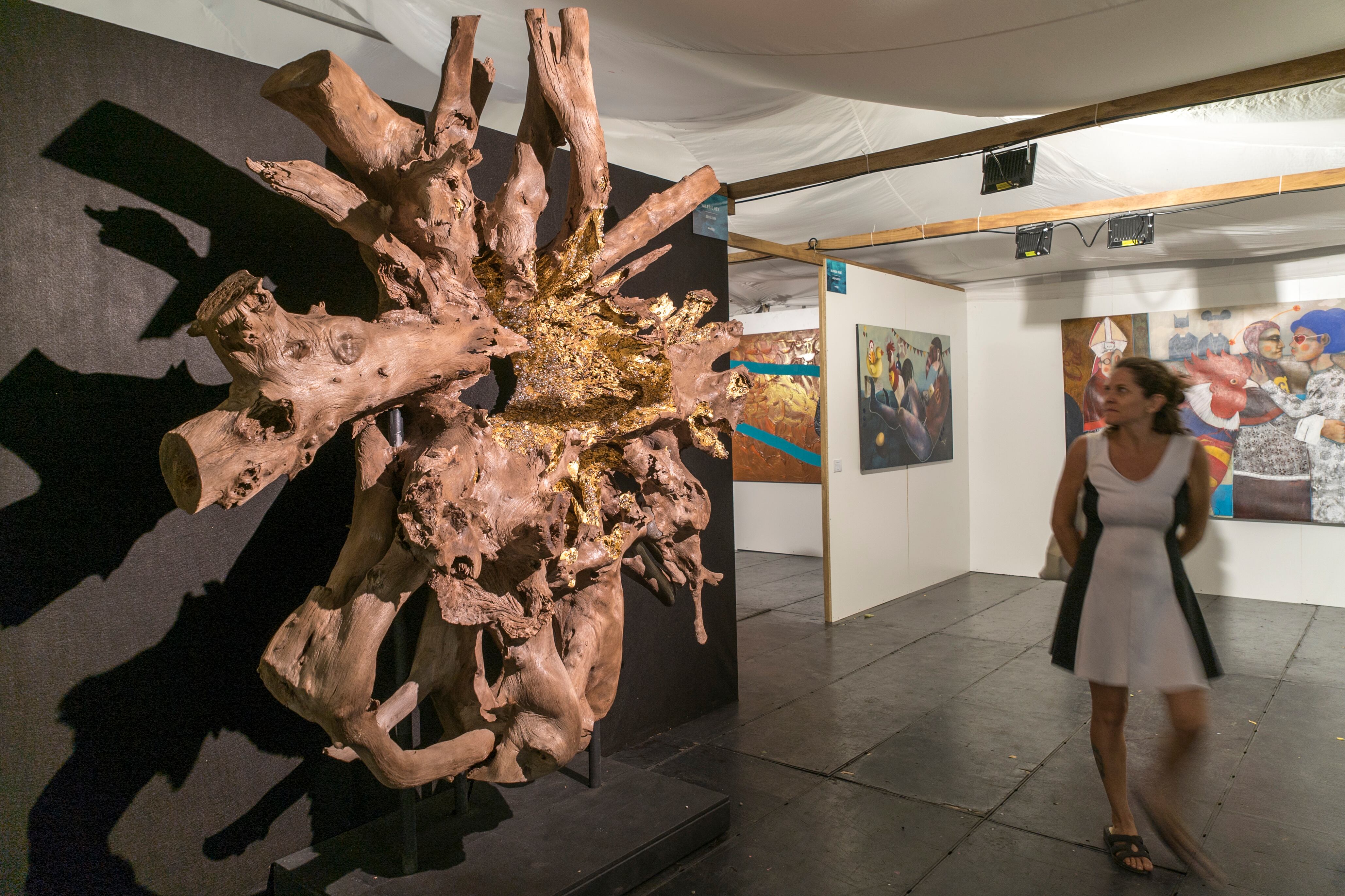 Los creadores también deambulan por los toldos y están entusiasmados por hablar con los visitantes sobre sus creaciones, sus temas y sus técnicas de trabajo. Entre las disciplinas de las obras expuestas hay pinturas, collage, performance y escultura.