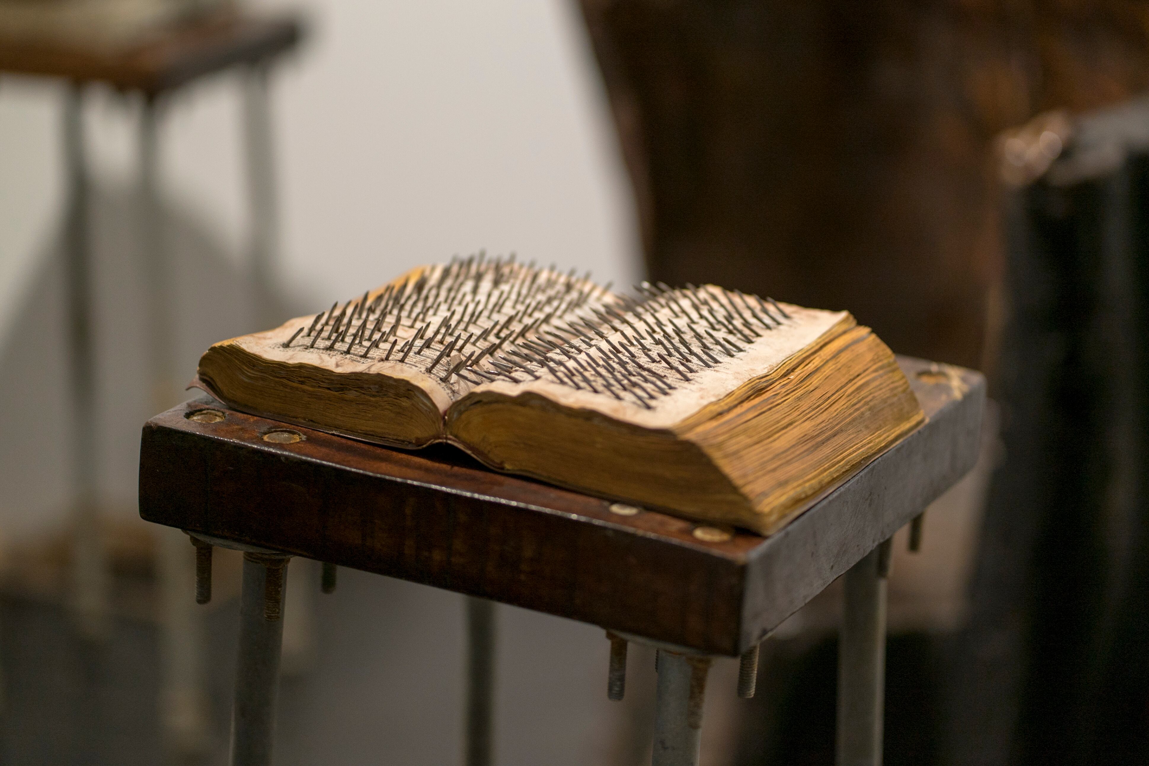 Brooks utiliza referencias de pinturas de la realeza española de antaño, procesa la imagen para obtener los patrones de color y, luego, borda las líneas en trozos de lino. En otra sección de su instalación, hay tres retratos de sus estudiantes, bordados de la misma forma.