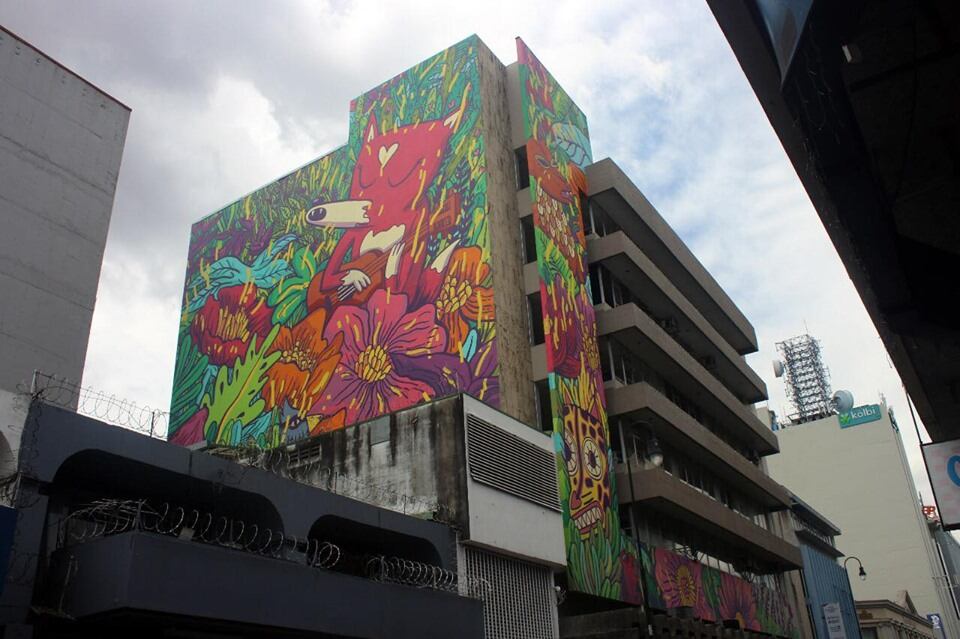 El animal, su inseparable guitarra y la naturaleza de su hábitat engalanan desde este jueves un emblemático edificio capitalino, cuyas fachadas Norte y Oeste fueron intervenidas como parte del proyecto Tu ciudad, tu lienzo, del colectivo San José Lab.