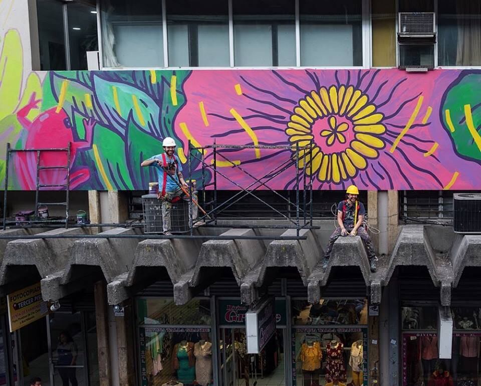El edificio Alde, ubicado en calle 1 y avenida central (frente a El Steinvorth) sirvió de lienzo en esta ocasión, y según el artista ganador de la convocatoria del proyecto para este año, Florecer busca volver a la tierra y admirar la capacidad de la naturaleza de emerger desde cualquier rincón en donde exista luz.