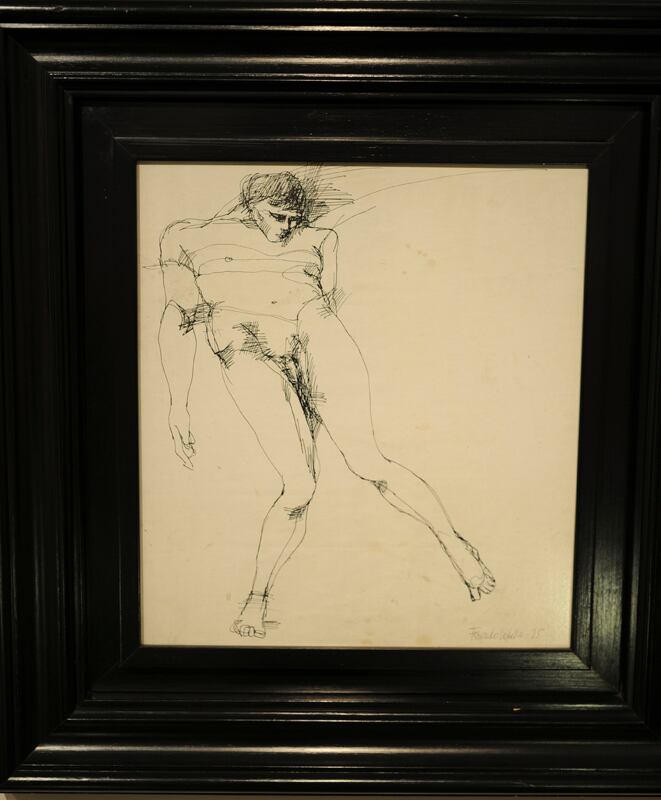 Otra figura es Escorzo masculino , tinta a la plumilla sobre cartón de 1975. Con la misma técnica, Fernando ejecutó Hombre , por el que recibió el Premio Nacional de Dibujo de 1978. “Escorzo” denota una visión oblicua, como la de un cuerpo echado en el suelo con los pies cerca de nosotros.