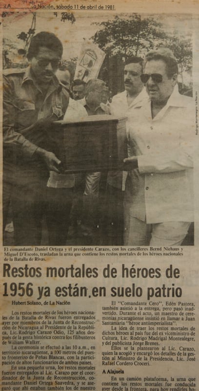 Juan Santamaría y Ernesto Cardenal. El proyecto de repatriar esos restos data de 1980, pero, solo en abril de 1981, la prensa costarricense siguió con mucha atención las negociaciones entre los gobiernos de Costa Rica y Nicaragua.