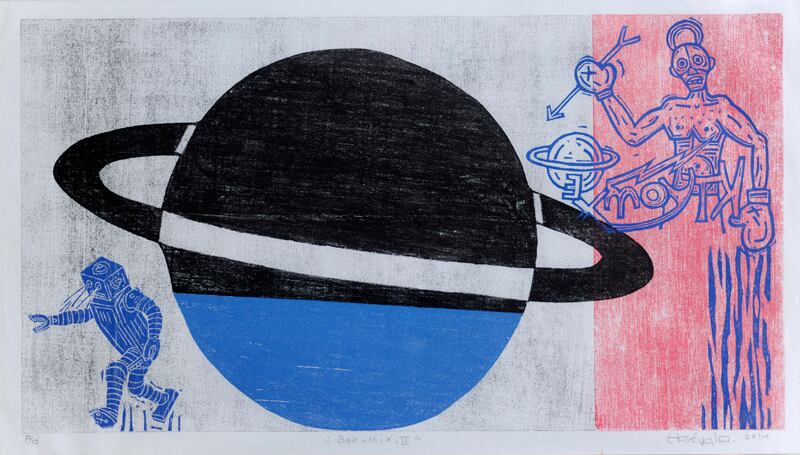 Al celebérrimo combate Ali-George Foreman debemos la más reciente exposición del grabador Arévalo: Versus, 13 obras realizadas en xilografía y cromoxilografía (obras en madera).