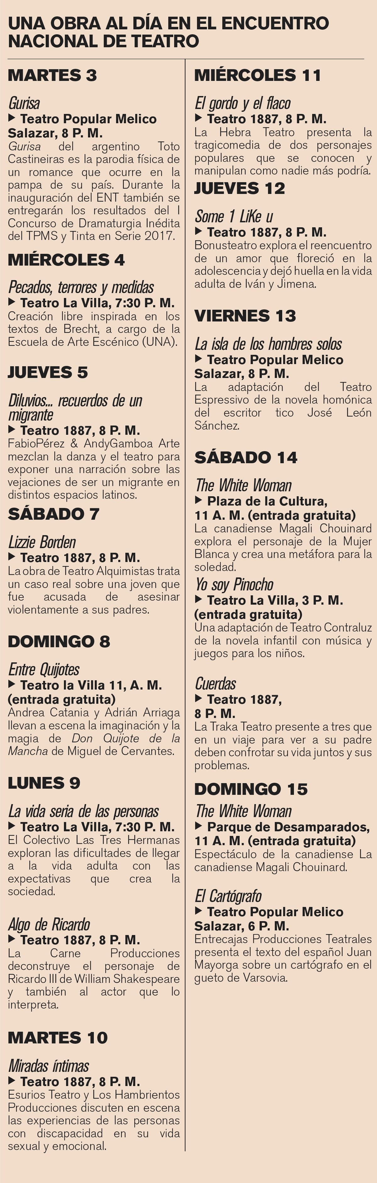 De 43 propuestas en concurso, la curaduría del Encuentro Nacional eligió 10 obras para su programación. Otros dos espectáculos los presentarán estudiantes de la Universidad Nacional y el Laboratorio Memoria de las Artes Escénicas (en su sede en el edificio La Alahambra).