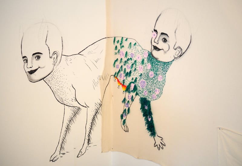 Técnica y concepto se unen así: “Trato de que el trazo sea fuerte y libre, y a la vez, que sea un poco invasivo. Es sucio, fuerte, sin pensar, libre. En cuanto al bordado, tiene toda la connotación de ser limpio, duro, definido”.