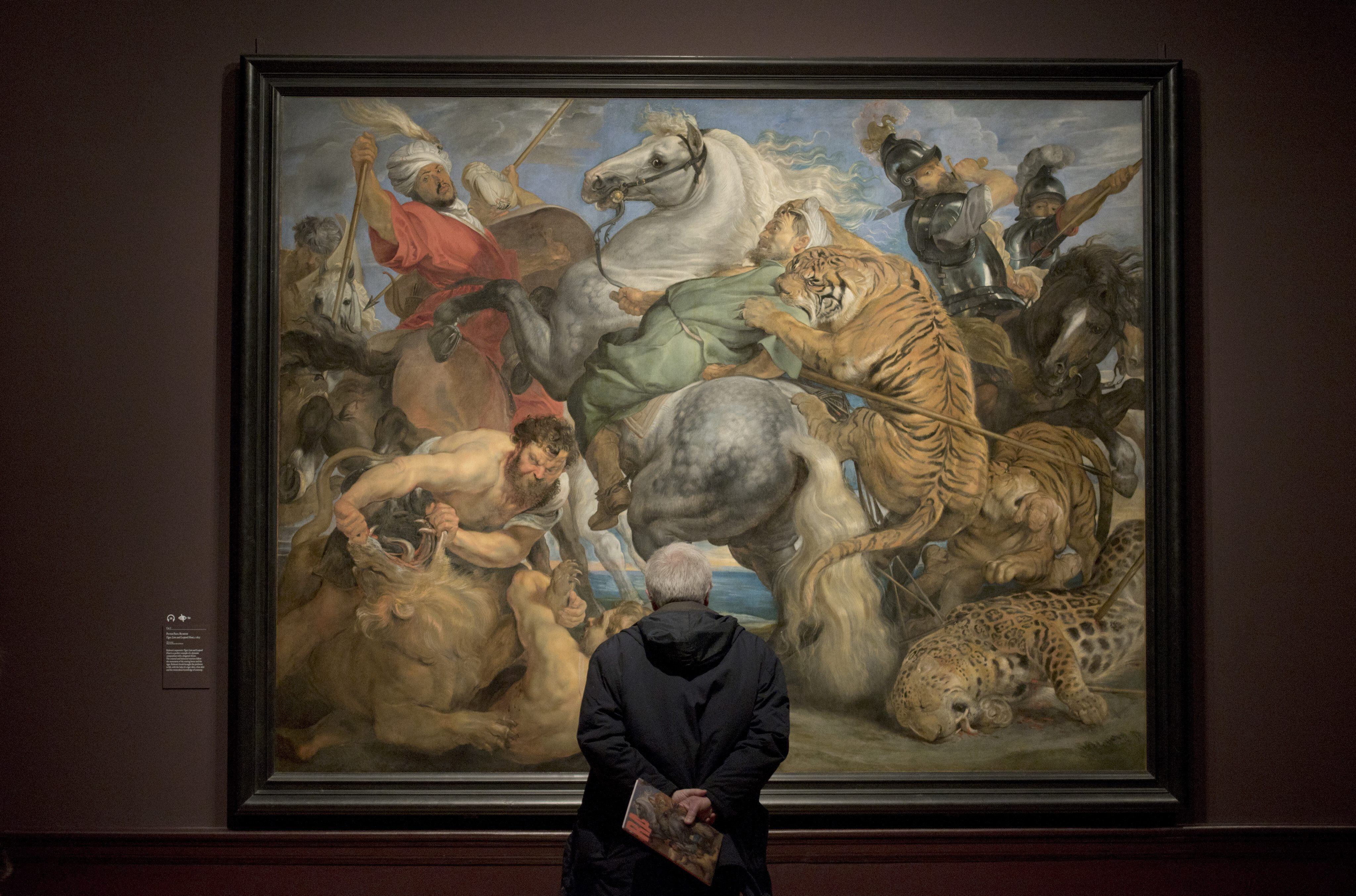 Un hombre contempla la obra "La caza del tigre" (1615-1616) del pintor flamenco barroco Peter Paul Rubens, que forma parte de una exposición en la Real Academia de las Artes de Londres (Will Oliver/EFE)