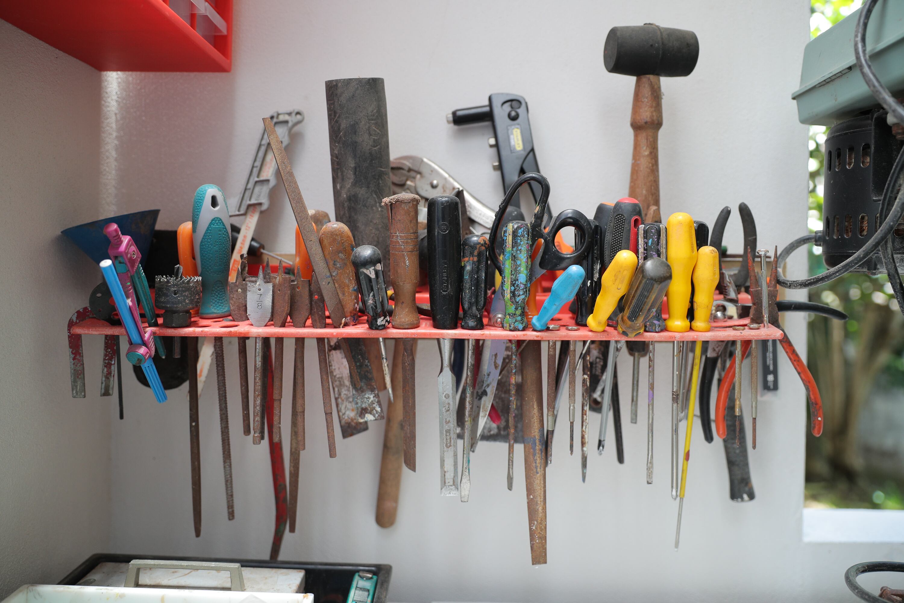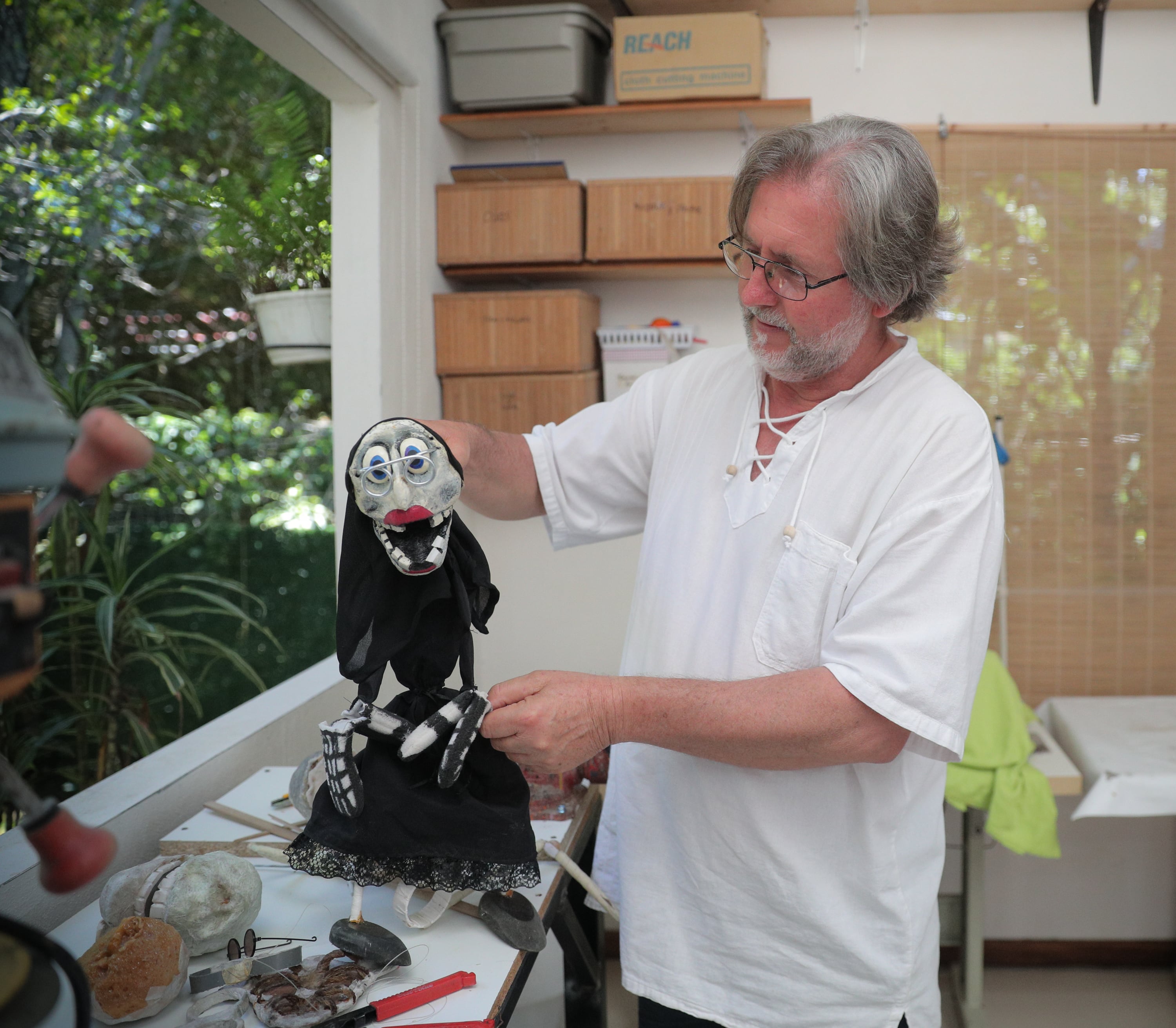 Fernando Thiel está en el taller que construyó en el patio de su casa. Toma unas marionetas de esqueletos que están regadas sobre el escritorio y comienza a jugar de ellas como si se tratara de un niño.