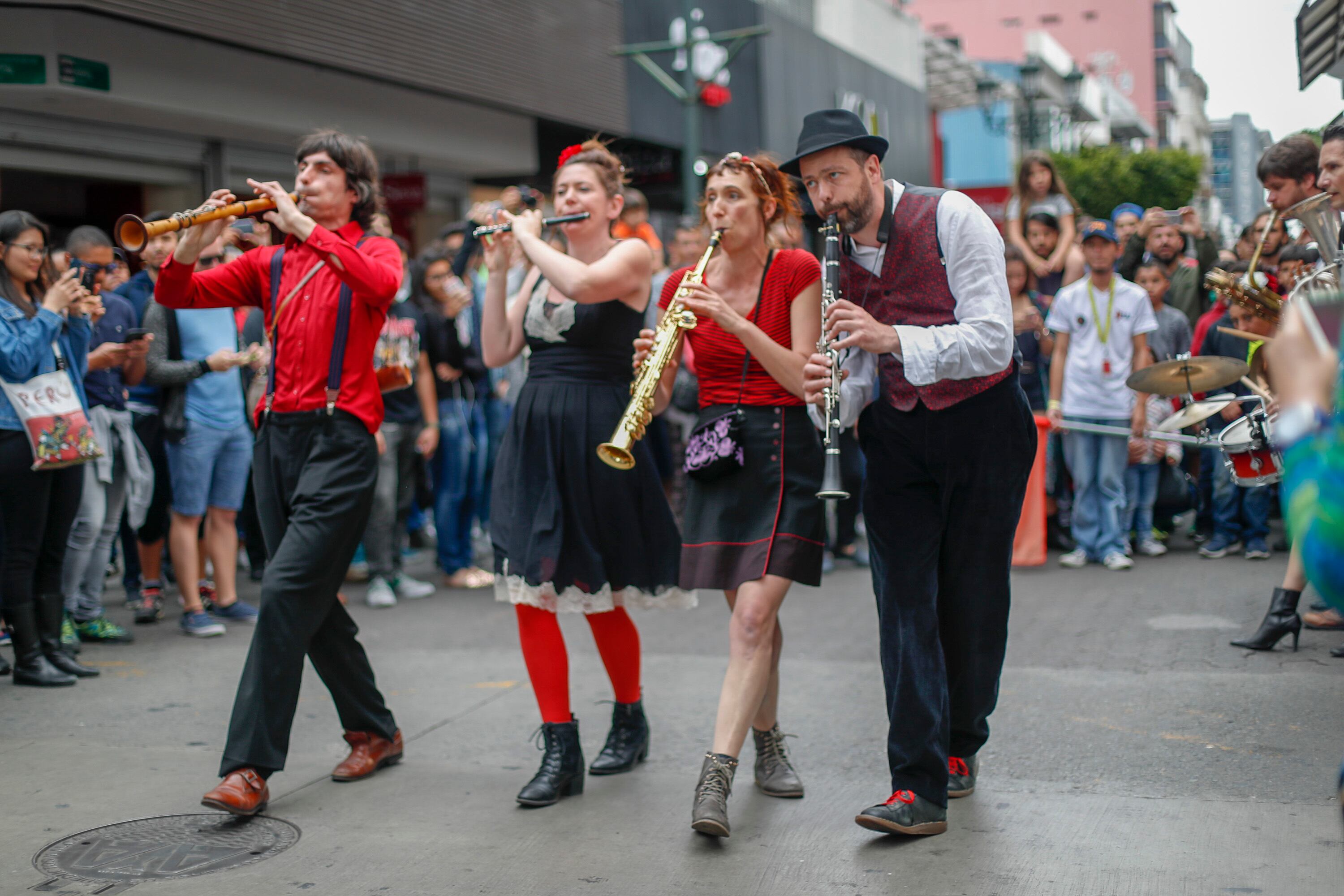 Su espectáculo Líneas de fuga los vio caminar, uno tras otro en fila india, mientras turistas extranjeros y familias enteras con coches de bebé seguían el sonido de la flauta, el clarinete y la frenética percusión.
