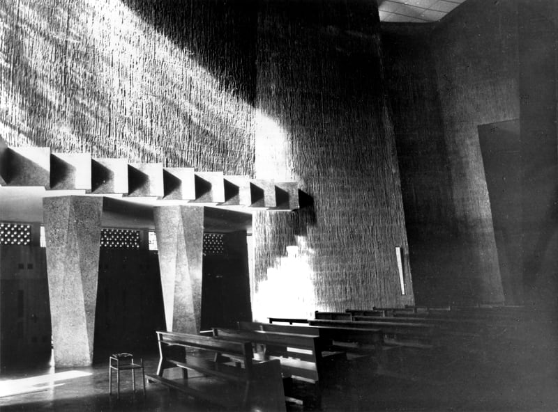 Por la misma razón, el interior rompía con la simetría propia de la tradicional planta basilical, y era su tenue penumbra la que se abría a los fieles para brindarles una nueva manera de experimentar el rito católico romano de siempre.