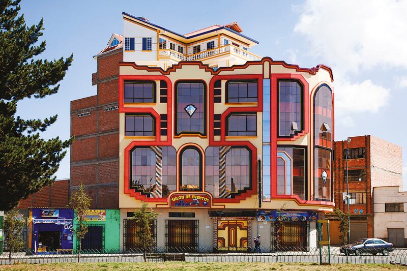 Los edificios diseñados por el boliviano siguen, por lo general, una estructura similar: en los primeros dos pisos se encuentran locales comerciales, luego un salón de baile y eventos –en ocasiones, incluso logran incluir canchas para practicar el fútbol sala–, encima de este apartamentos para alquiler y, por arriba de todo, la casa del dueño. Todo, por supuesto, enmarcado en su característica explosión de líneas y colores.