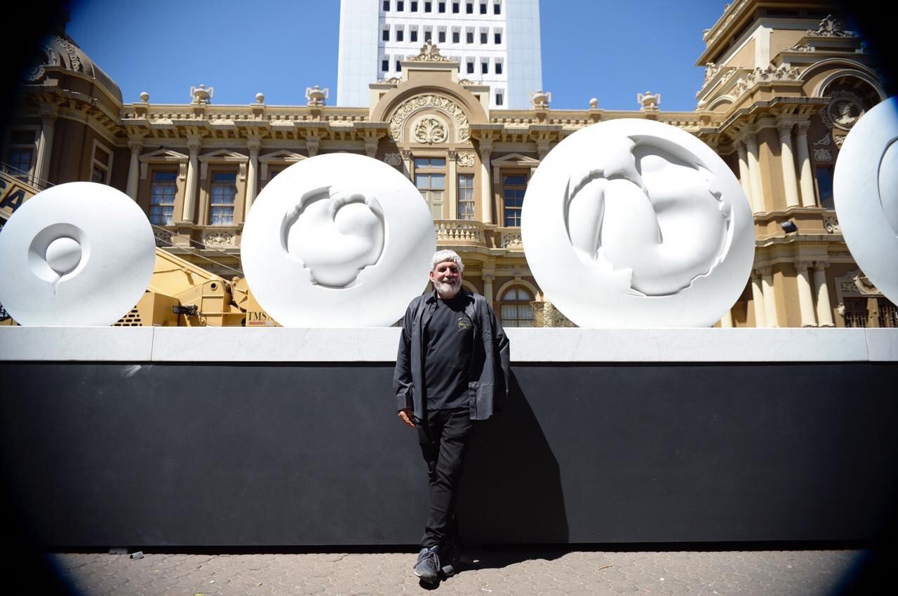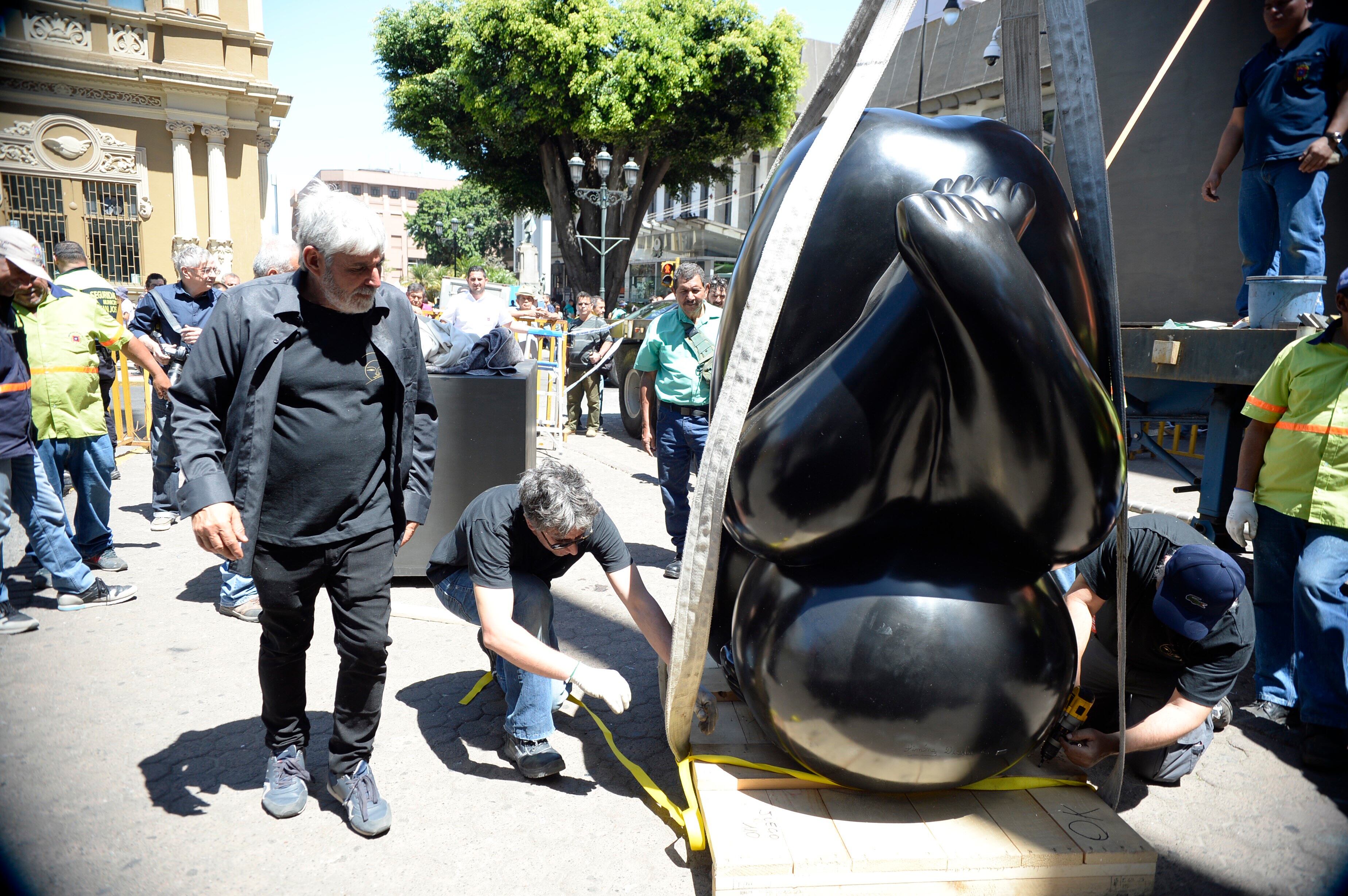 Jiménez Deredia, frente al edificio de Correos desde temprano, estuvo muy involucrado en cada detalle. Vestido con camisa y camiseta negra, jeans negros y unas tenis oscuras, el escultor de 64 años se aseguró primero de que la base de las esculturas estuviera al nivel correcto.