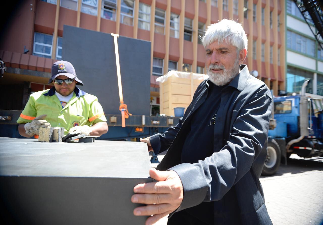 Se le ve tranquilo en entrevistas, pero en los montajes, él es el primero en tocar la pieza, forcejeó para abrir las cajas de madera, empujó las lingas que sostenían con grúa sus obras, le pone jabón a las bases que sostendrán las esculturas para que el acomode sea más fácil.