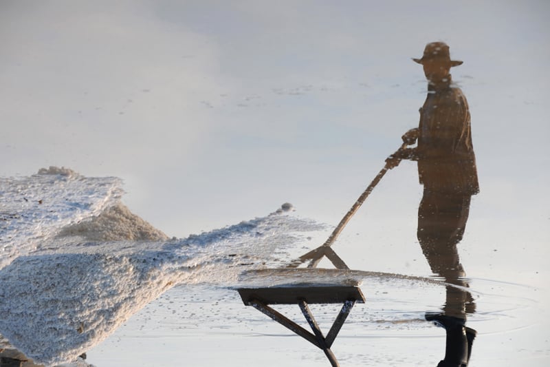 Esta fotografía exhibe el reflejo en el agua de sal de uno de los trabajadores que se afanan en tan ardua labor. Que esta sea tan extenuante no impide que nos ofrezca escenas hermosas que un fotógrafo procura captar.