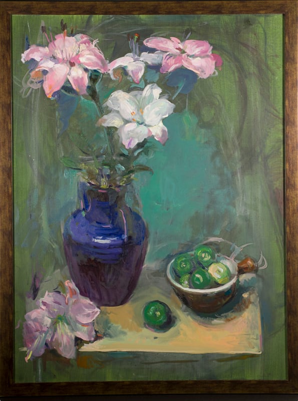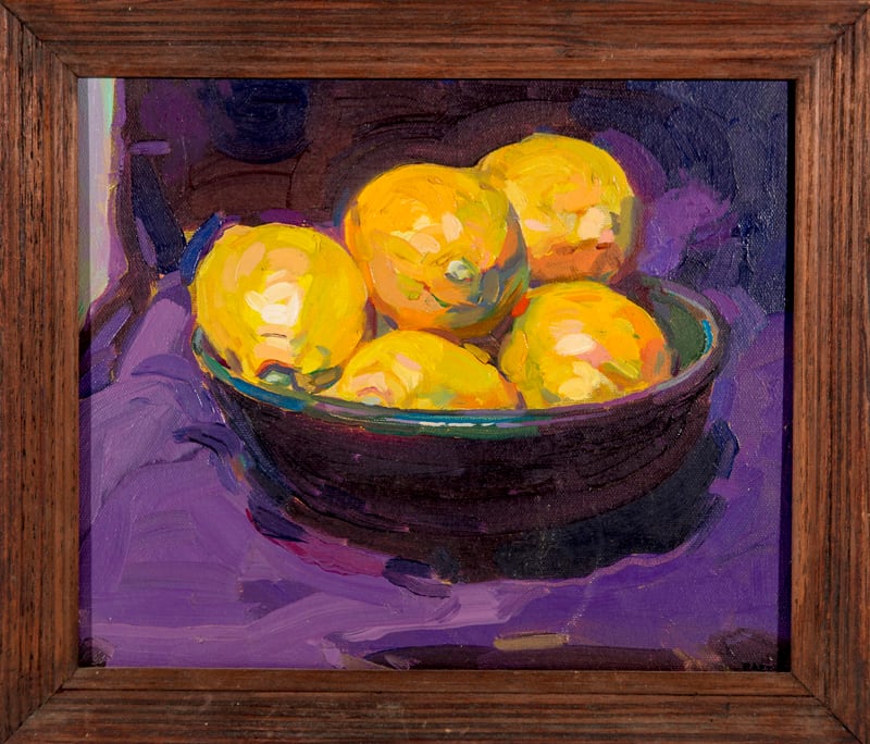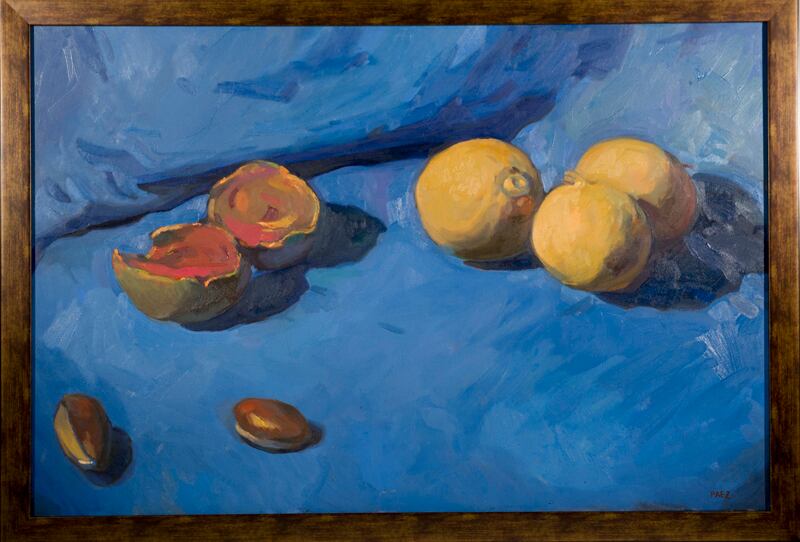 Mesas servidas. Un José Miguel Páez bellamente impresionista se confiesa en cuadros como Jarrón verde , Jarrón azul , Nísperos y naranjas y en una pintura de pequeño formato, sin título, que ofrece cinco limones sobre un fondo morado.