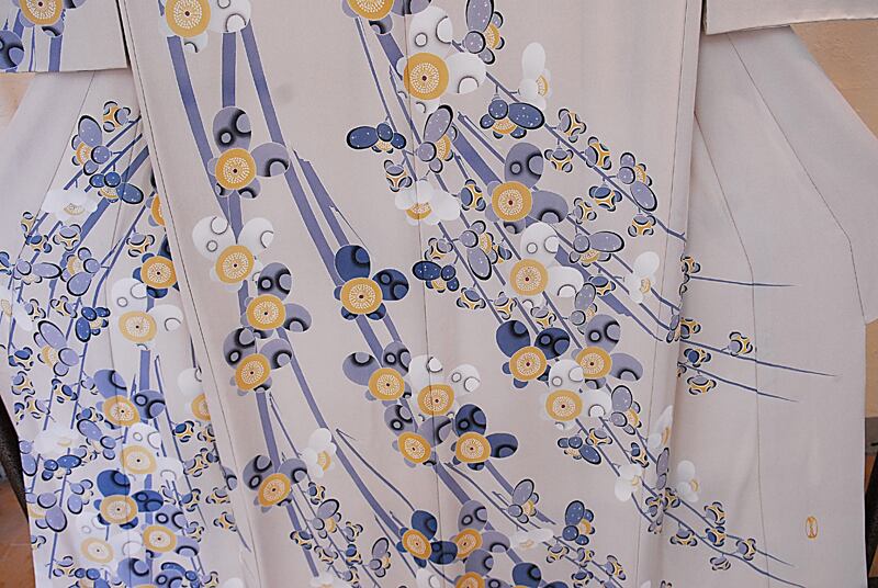Por su parte, imponente y glorioso se muestra un kimono semiformal de cuya seda nace un jardín de flores que baila entre el púrpura, el amarillo y el blanco. Teruhiko Shiozawa elaboró la pieza por medio de la técnica Yuzen propia de Tokio (siglo XVIII), la cual consiste en teñir el textil con un bosquejo del diseño cubierto de pasta de arroz. Luego se pintan a mano los dibujos.