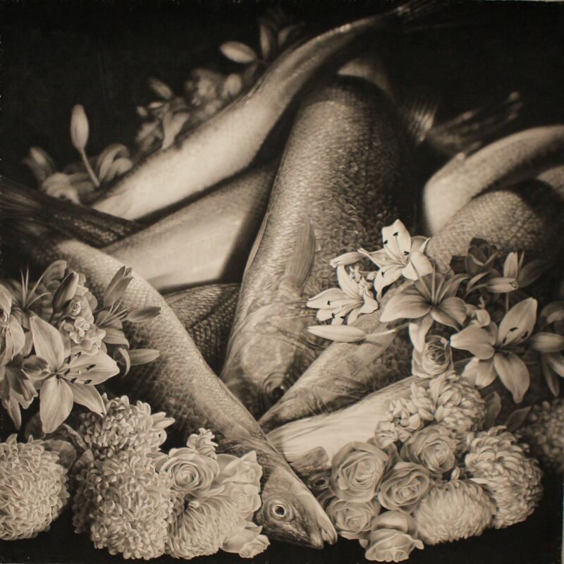 Confesiones y fotorrealismo. Herencia del arte nos ofrece ventanas a otros movimientos estéticos. Uno de ellos es el fotorrealismo, que se expresa de manera asombrosa en Cascada (2003), del estadounidense Joseph Stashkevetch, una representación en blanco y negro de peces y flores. “Para elaborar esta pieza, Stashkevetch utilizó lápices de colores y lápices conté, que mezclan el grafito con la cera. El dibujo emula diversos efectos ópticos propios de los lentes fotográficos, como la profundidad de campo”, afirma María Alejandra.