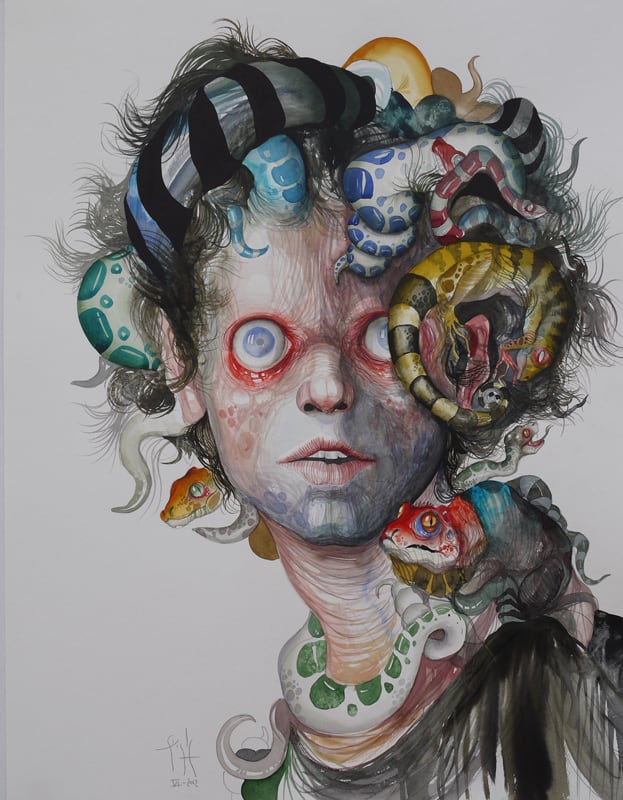 La exposición también brinda acuarelas de mediano formato: Gorgonas I, II y II , trasunto de un mito griego: monstruo-mujer erizada de serpientes, que, para José Luis, se han trocado en engendros impensables que aquí están.