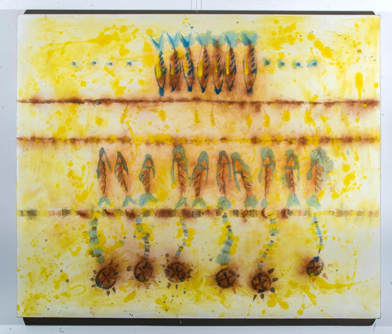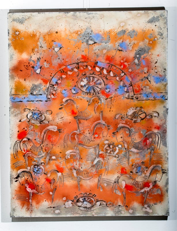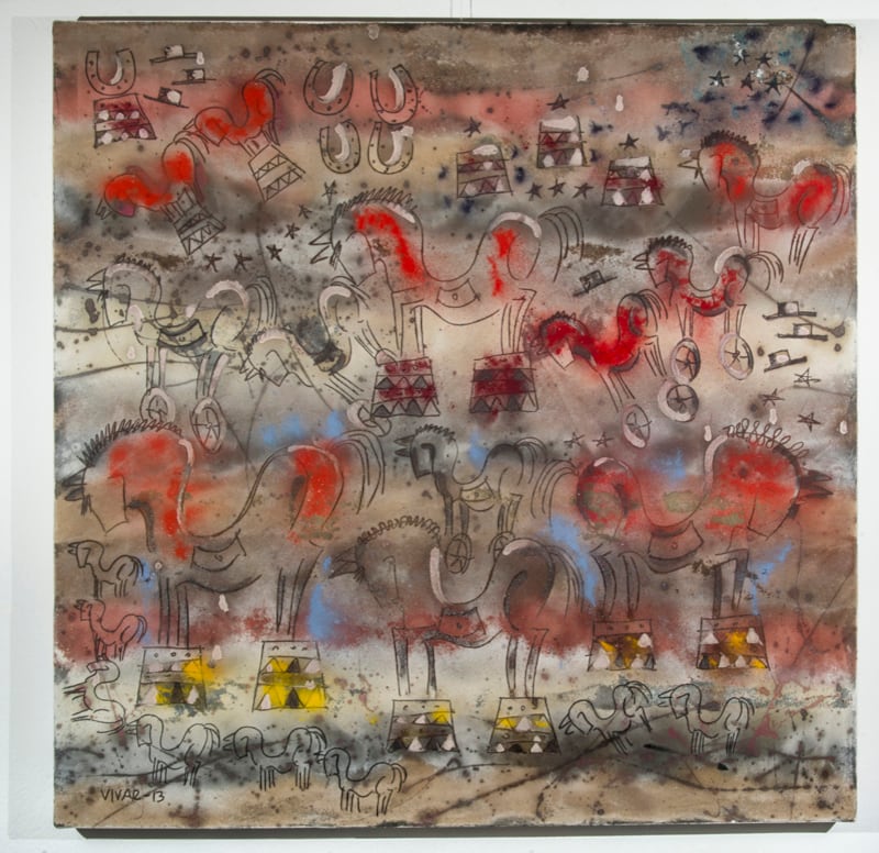 Sobre las ásperas texturas arcillosas, se decantan las formas y los colores de Vivar. Se trata de un repertorio de muchos Leitmotive : bicicletas, payasos, botellas, iglesias, caballos, calacas, huesos, sillas; pero sucede algo muy peculiar.