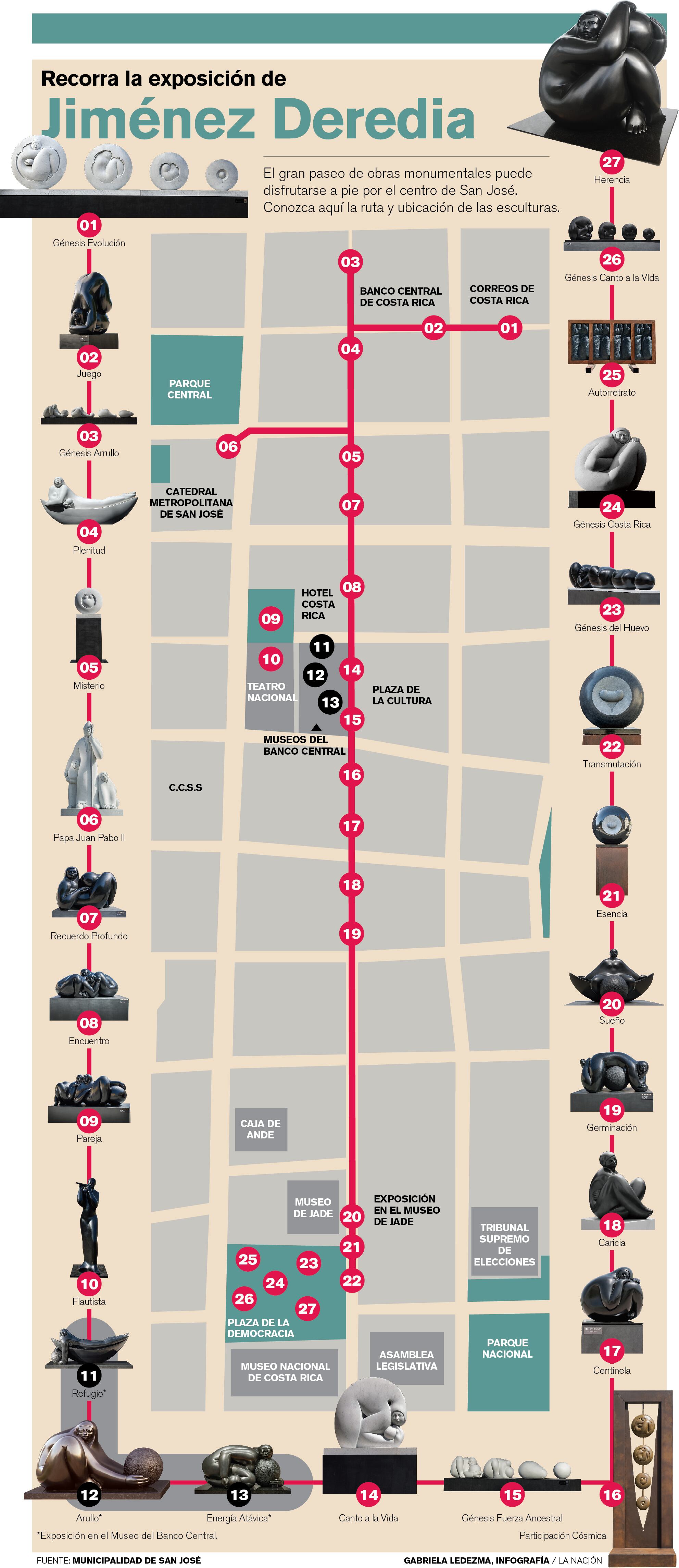 Jiménez Deredia en San José: La fuerza y la universalidad de la esfera es el título que lleva esta exposición monumental de 27 esculturas que recorre, literalmente, las venas de San José. La exposición, empujada por el municipio de la capital, brota desde la plaza de los Correos de Costa Rica en avenida 3, atraviesa el bulevar de la avenida central, recorre las inmediaciones de la Plaza de la Cultura y acaba en la Plaza de la Democracia, sitio donde se encuentra la mayor cantidad de obras monumentales (para el detalle de cada una de las obras puede consultar la infografía que complementa esta publicación).