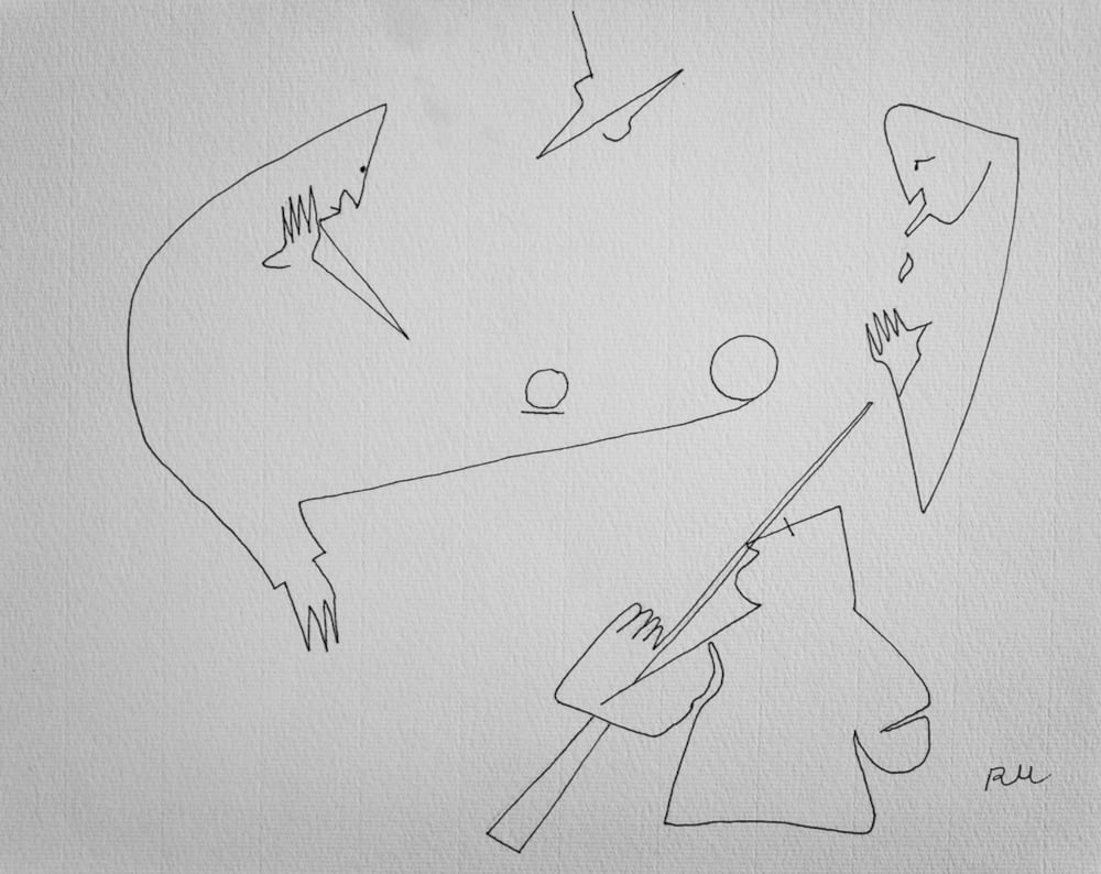 U na línea entra a un billar y se convierte en un hombre, primero, luego en una mesa, y finalmente en una bola de marfil. Al otro extremo de la mesa humana, otras dos líneas se pasean por el mismo papel. También “son” humanas, pero a la vez son un cigarro encendido y el taco con el que el que uno de los personajes se dispondrá a mejorar el juego cuando le llegue su turno.
