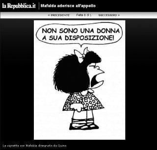 “No soy una mujer a su disposición”, dice una enojada Mafalda desde una doble página del diario La Repubblica , de Italia, en un dibujo que envió Quino y que repite las palabras con que la diputada Rosy Bindi respondió a un comentario machista de Berlusconi días atrás. La frase se ha multiplicado en camisas y mantas.