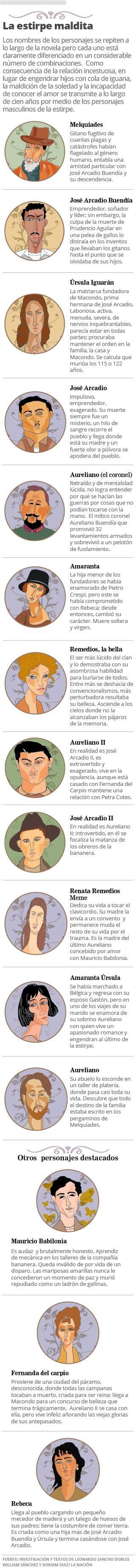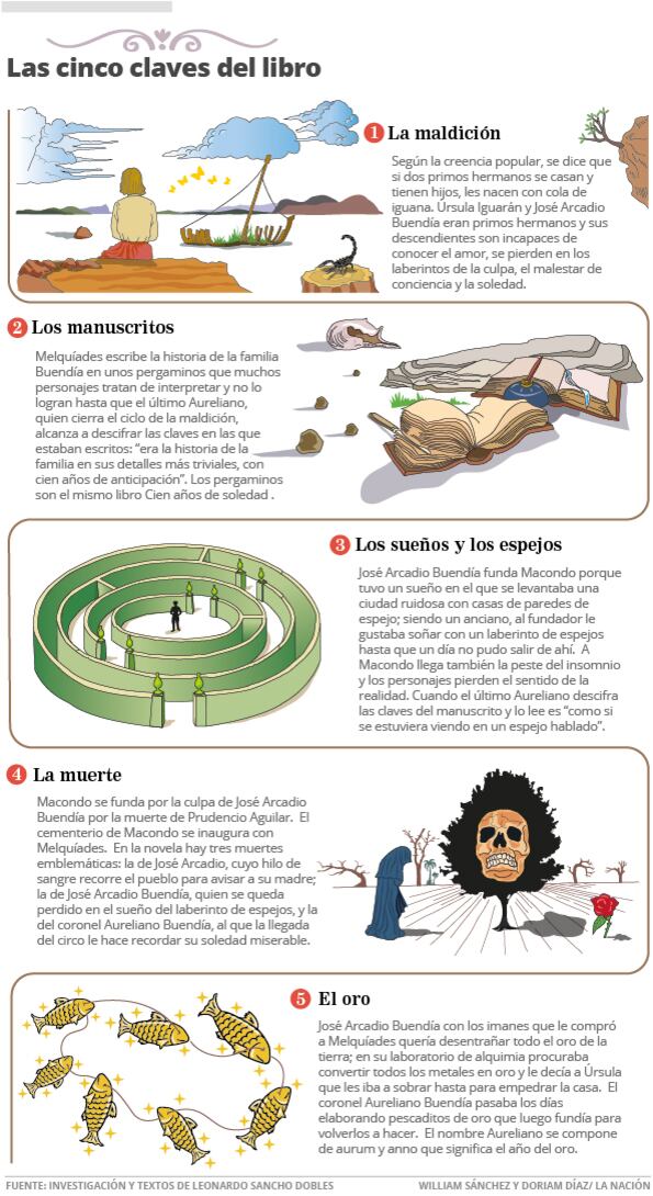 Las genealogías idénticas, la idiosincrasia de los personajes, la reiteración de las situaciones y los leitmotiv – muchos años después y años después –, que se suceden cíclicamente como un recurso mnemotécnico para volver al principio, le dan a Cien años de soledad el tono de una gran rueda de tiempo novelesca que gira sobre sí misma en una espiral descendente, en una maldición condenada a cumplirse porque está previamente escrita y predeterminada en el inmutable orden de la tradición –la superstición, la magia, el tabú– y de los documentos –los pergaminos de Melquíades–.