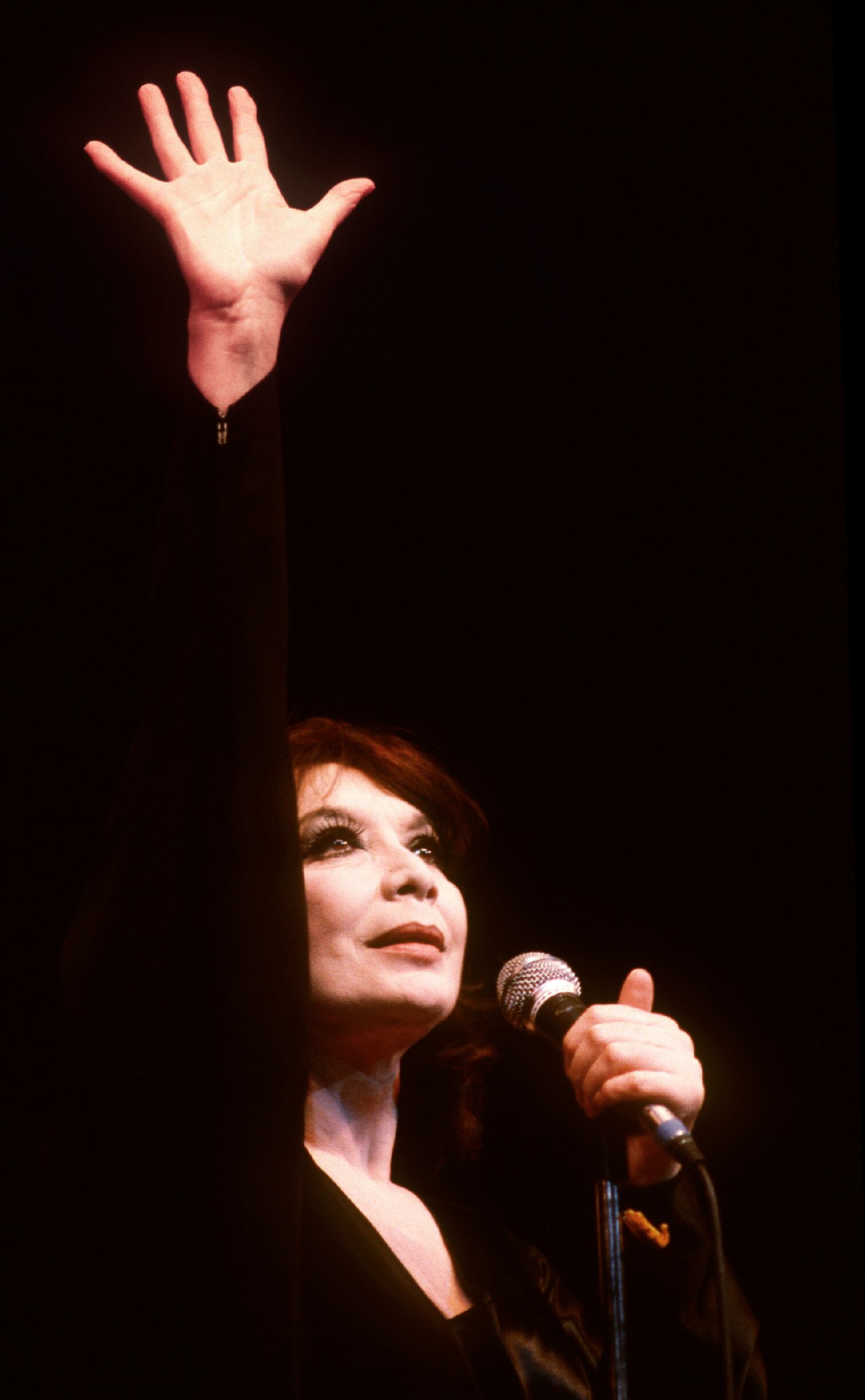 Con sus pómulos altos, una mirada penetrante de ojos negros bajo su cabellera oscura y finas manos blancas moviéndose sobre un vestido, la cantante imponía en el escenario una imagen de dama negra.