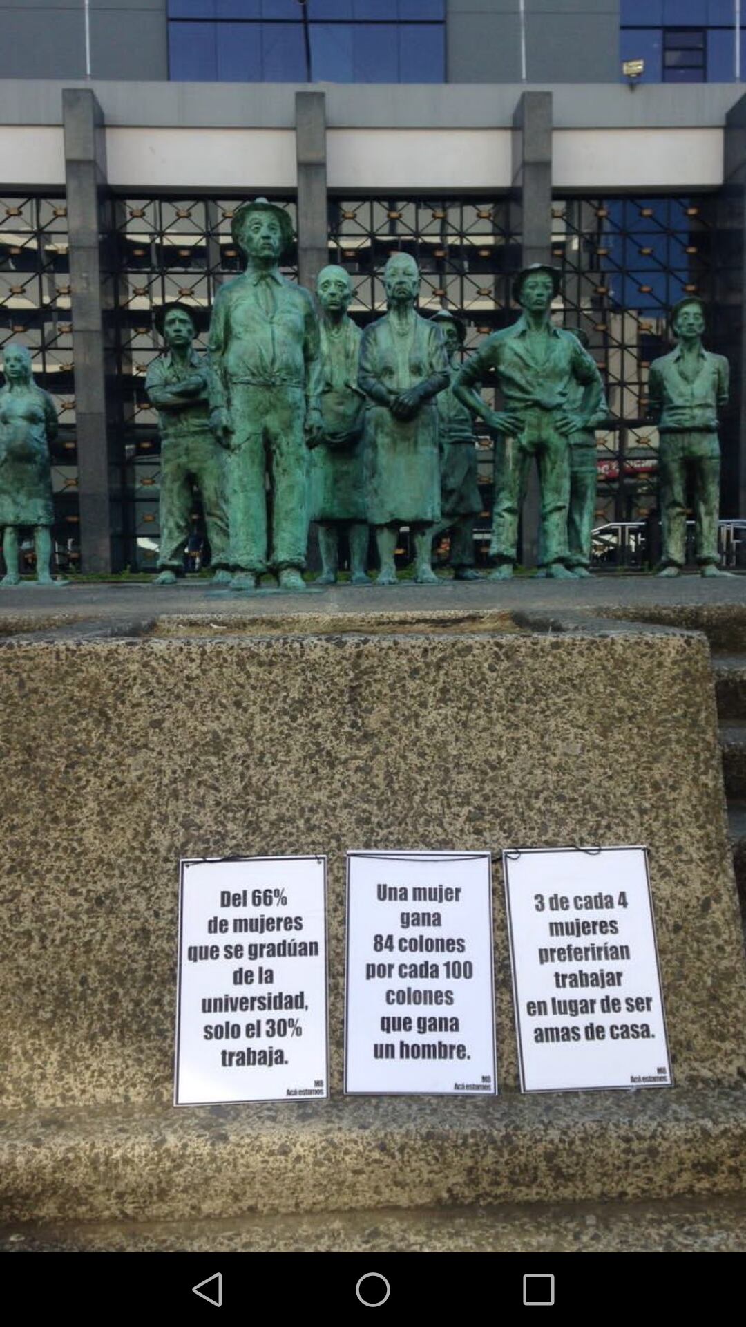 "Una mujer gana 84 colones por cada 100 colones que gana un hombre", se leía en otro rótulo, colocado en una escultura frente al edificio del Banco Central.