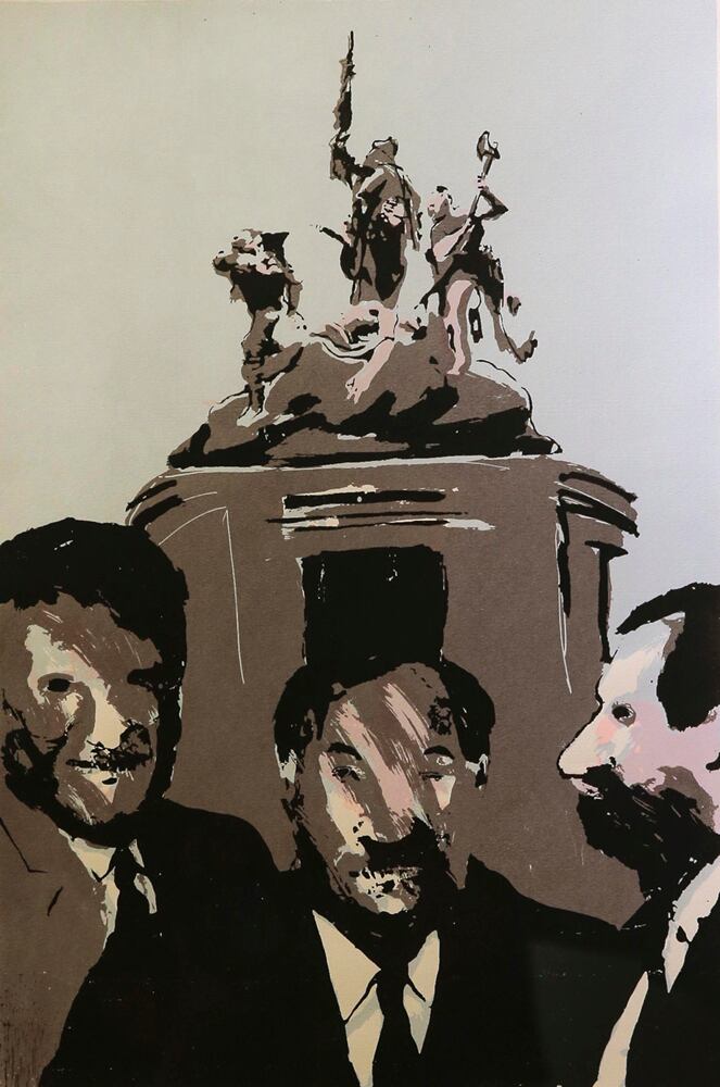 A esos tres personajes se les ve en los bajos de la plaza de la Cultura como parte de un variopinto conjunto de 42 obras de artistas costarricenses, en que hay trabajos de José Miguel Rojas, Sila Chanto, Adrián Arguedas, Luisa González, Francisco Amighetti, Guillermo Tovar. Karla Herencia, Roberto Guerrero, Cynthia Soto y Joaquín Rodríguez del Paso, entre otros.