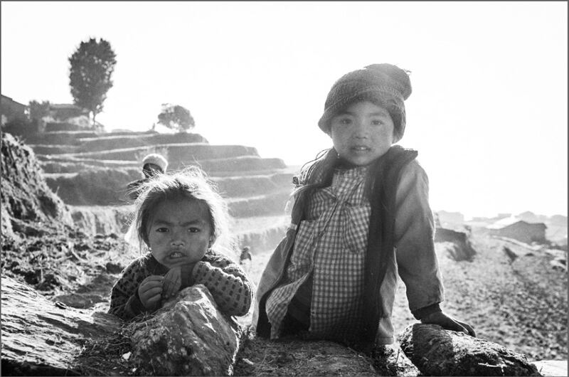 Esta fotografía se titula Después de la jornada y pertenece a una serie de retratos fotográficos infantiles. Se ve a dos niñas con el Sol a sus espaldas en un bello día de invierno en el pueblo de Barpak (Nepal). Es el atardecer, y las niñas esperan que sus madres regresen de las terrazas cultivadas que se desdibujan detrás. Puede ser que las niñas también hayan estado trabajando arduamente durante toda la tarde al lado de sus madres.
