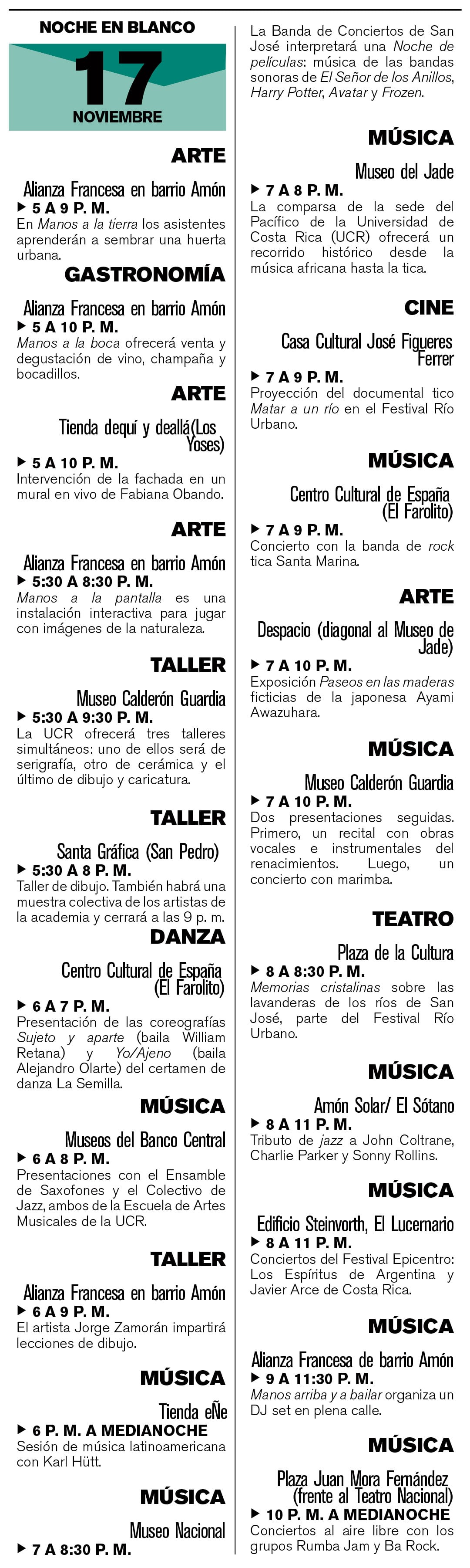 Este viernes 17 de noviembre, a partir de las 5 p. m., el turismo en San José podrá visitar exposiciones, degustar platillos y bailar hasta la medianoche.