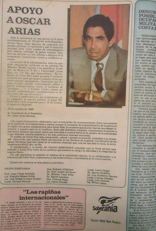 Soberanía envió una carta a Arias que Universidad publicó el 7 de noviembre. En ese momento, cuando se hablaba públicamente del inicio de una intervención directa de los Estados Unidos en Nicaragua, Soberanía escribió: