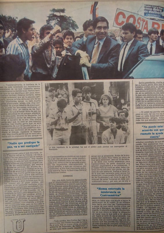 Añadía que, a pesar de la presión venida desde Washington, “la llegada de Óscar Arias al poder, el 8 de mayo pasado, significó una corriente de aire fresco en medio de una Costa Rica desvergonzada al servicio de las políticas de Ronald Reagan”.