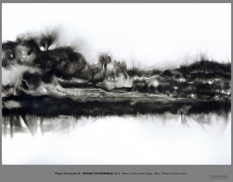 El título de esta obra es Paisaje vulnerable y mide 120 x 170 cm. Las técnica que apliqué son el humo y la tinta sobre lienzo. El cuadro data del año 2014. La obra surge como parte de un proceso de investigación que inicié en el 2009.