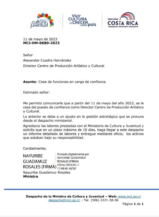 Por medio de cartas idénticas, la jerarca prescindió de las jefaturas de tres órganos adscritos al Ministerio de Cultura y Juventud (MCJ) y una dirección interna, las cuales dirigían las labores del archivo histórico del país, la producción artística, la apreciación de la música y la gestión sociocultural.